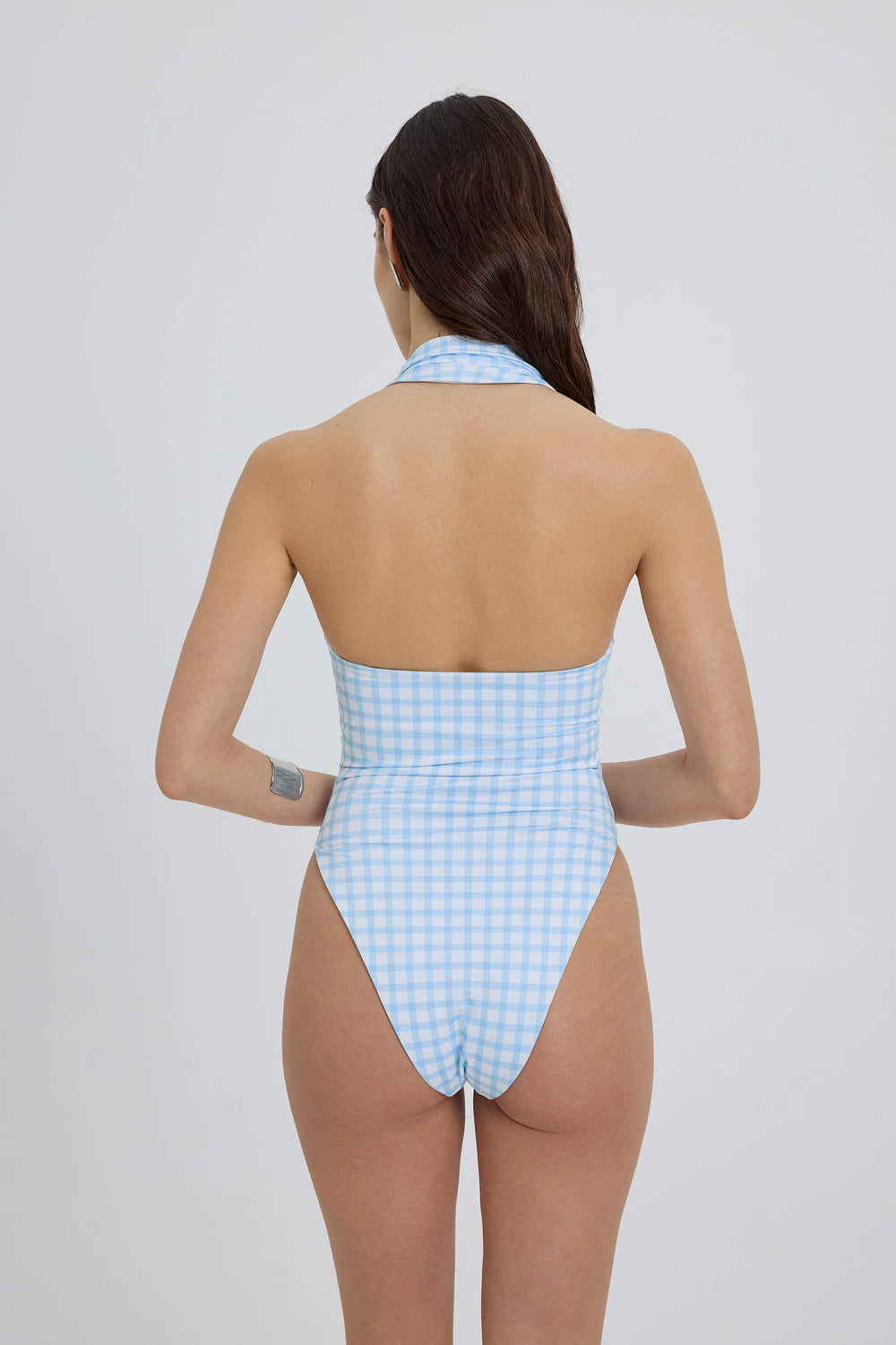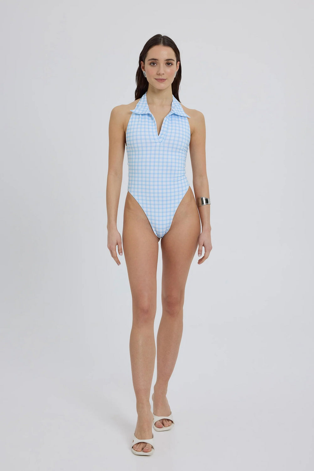 Enterizo con cuello estilo polo con una abertura en la parte frontal. El corte es ajustado al cuerpo, resaltando la silueta, y tiene un diseño de pierna alta.