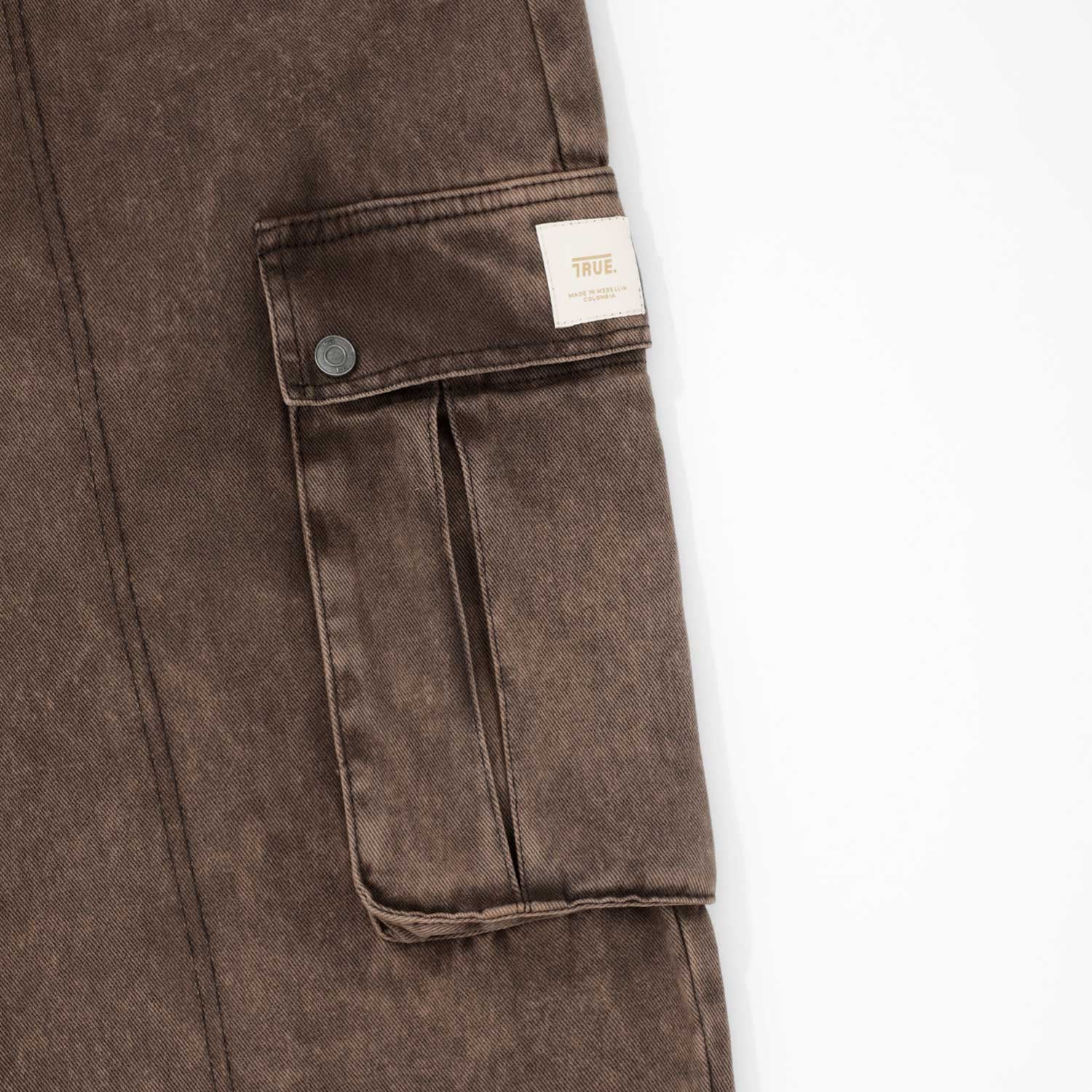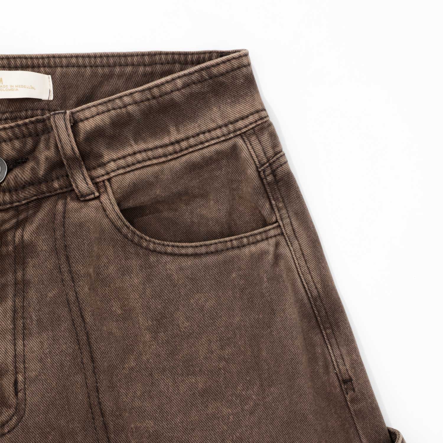 Pantalones cargo de mezclilla lavada en marrón oscuro. Cuentan con dos bolsillos estilo cargo en la pierna derecha y uno en la izquierda. Tirantes ajustables en los tobillos para un mejor ajuste. Fáciles de combinar con nuestras camisetas y tops.