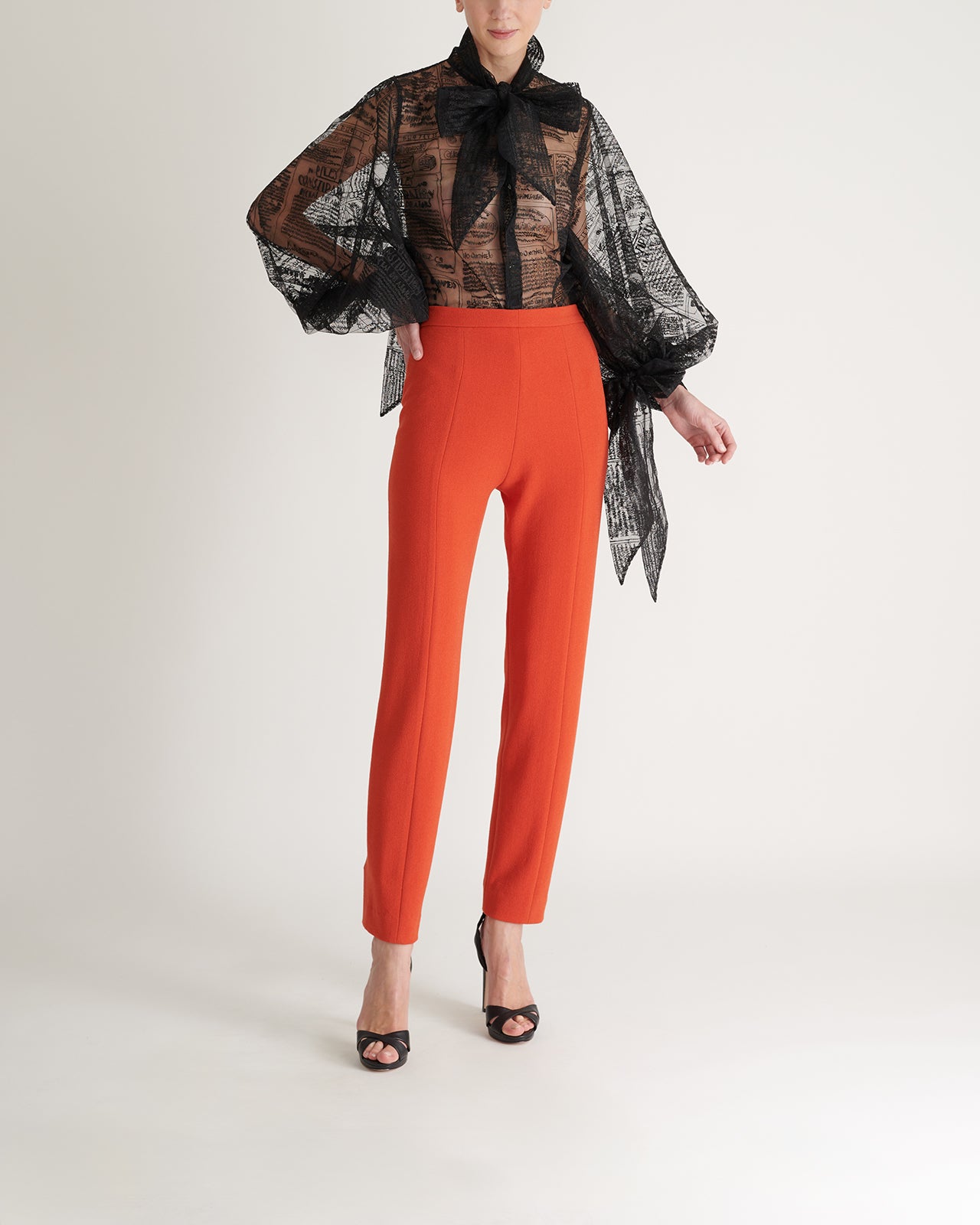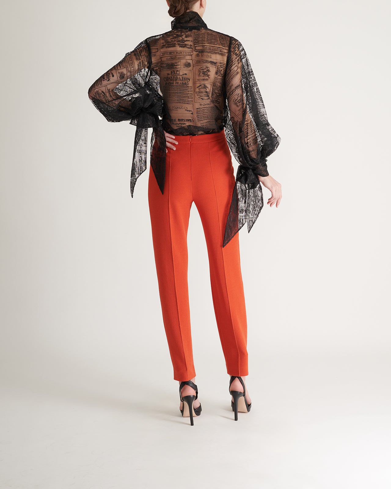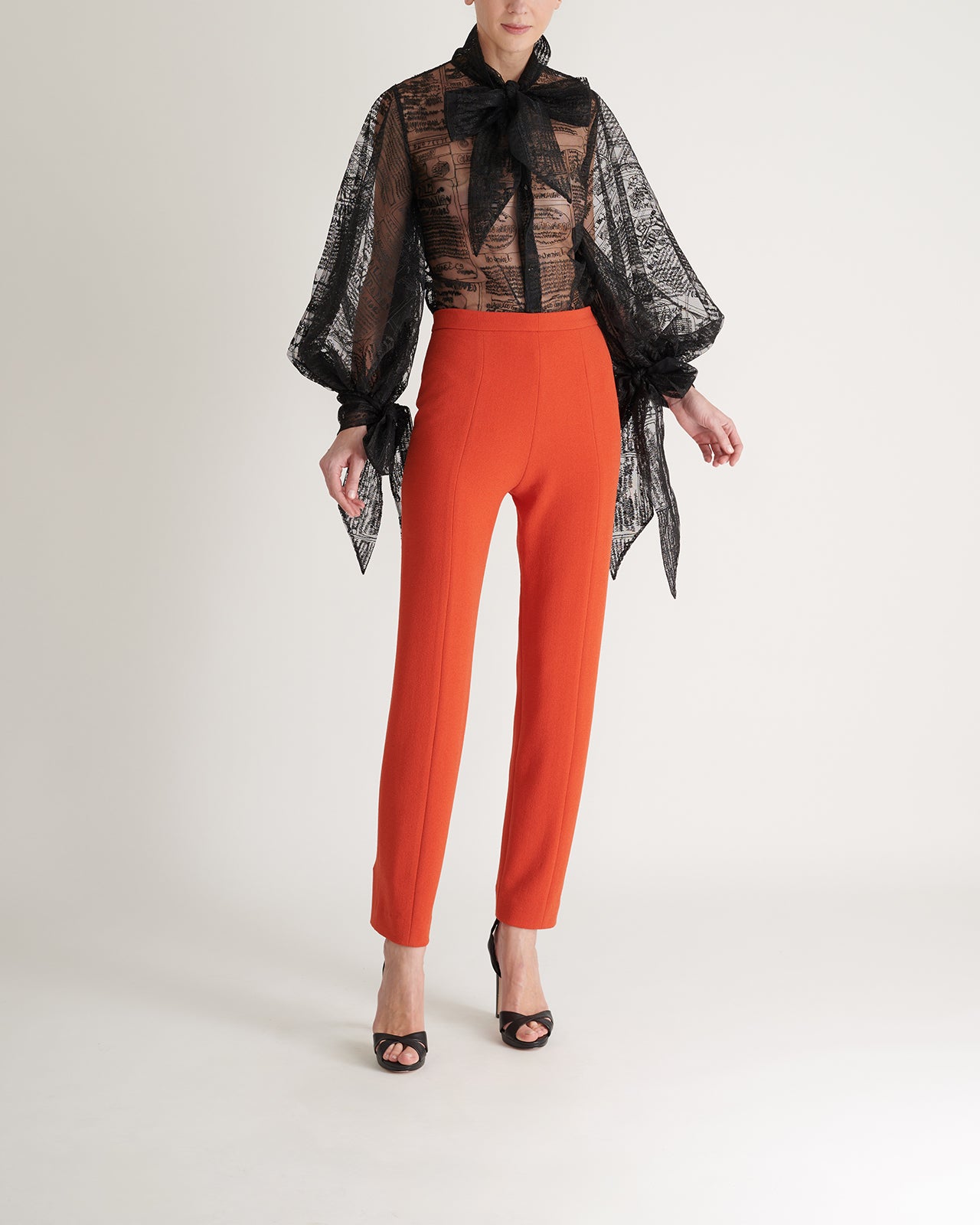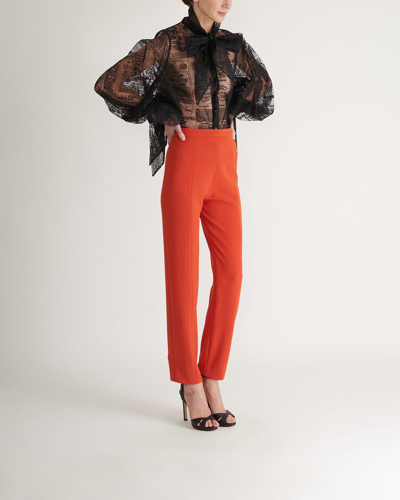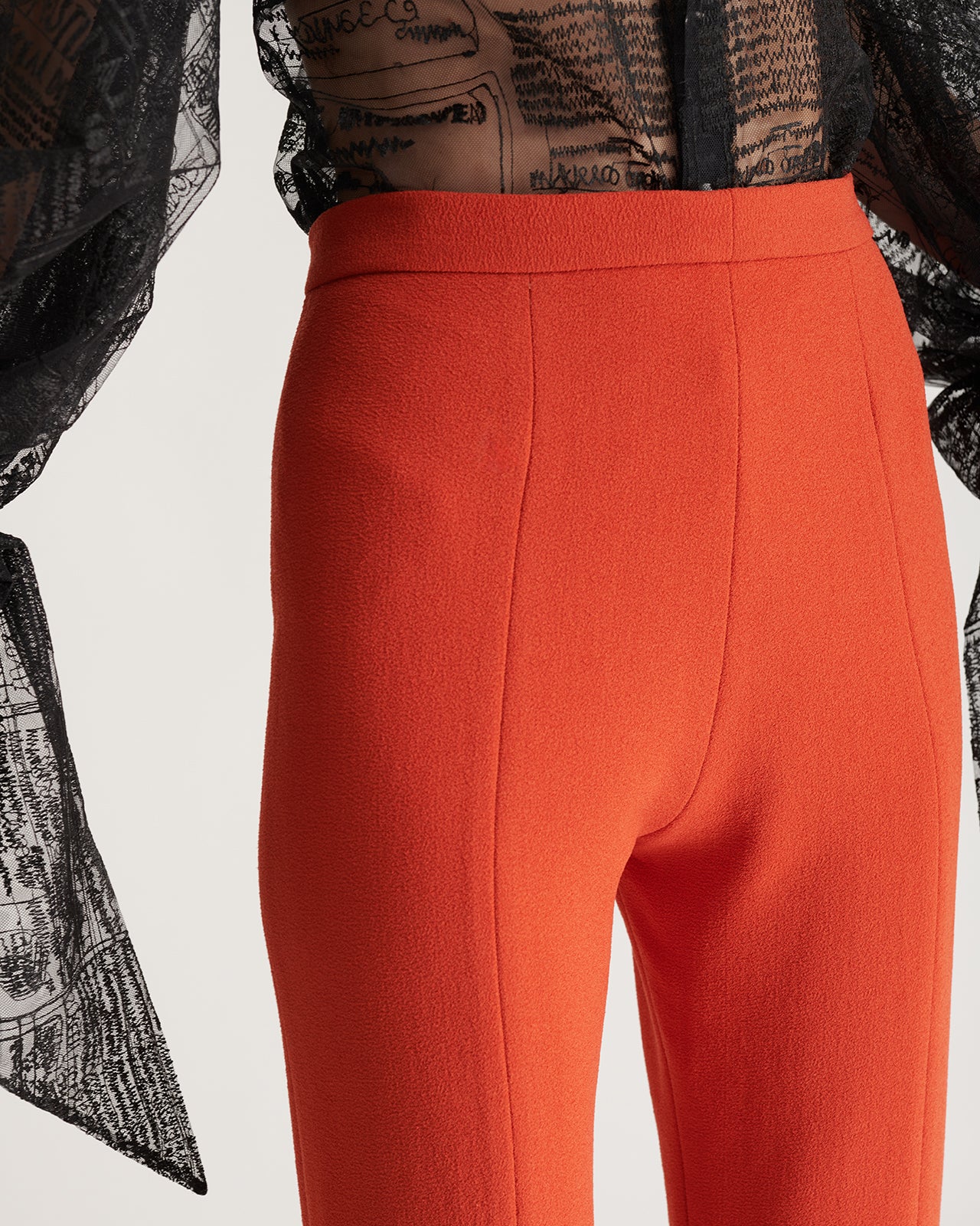 Pantalon en crepe de seda tiro alto ajustado y suelto, con cierre en la parte delantera.