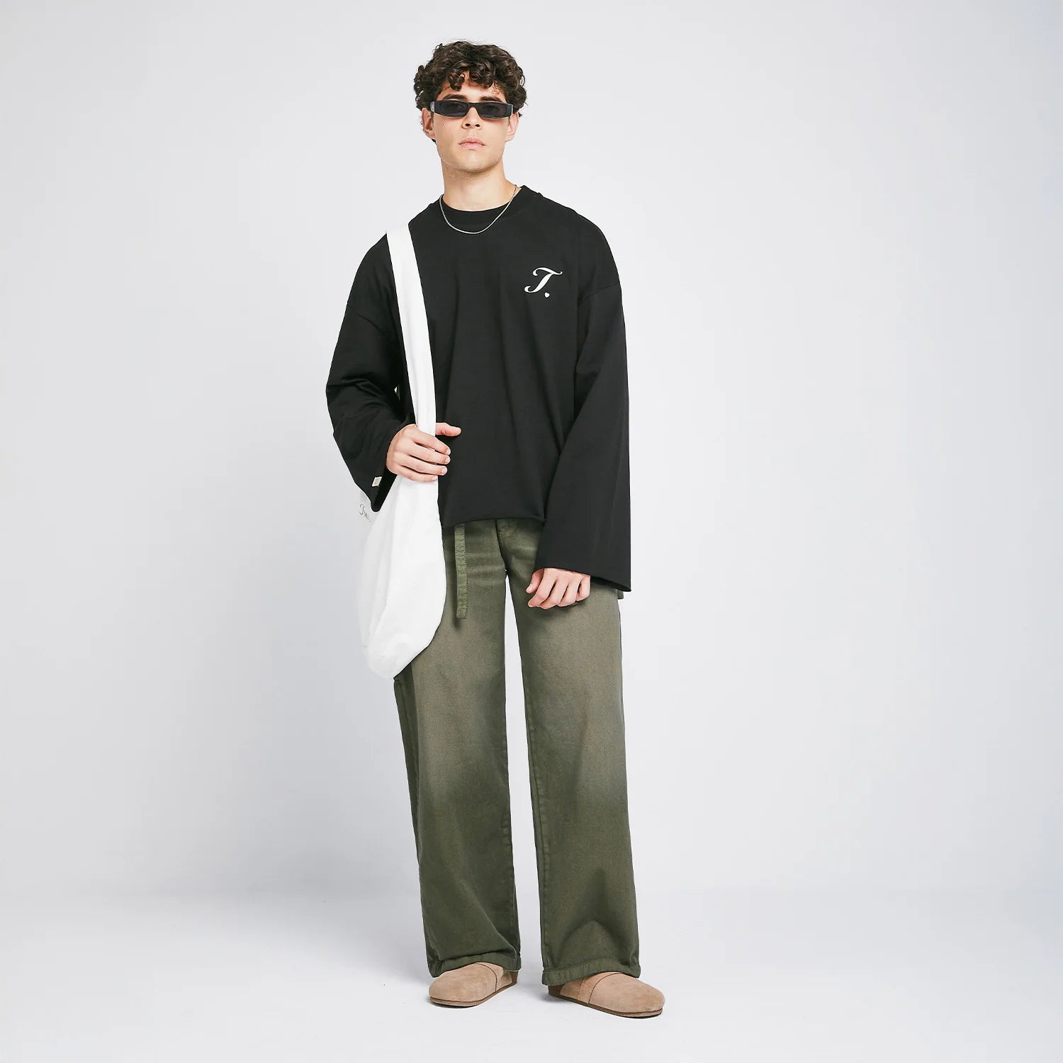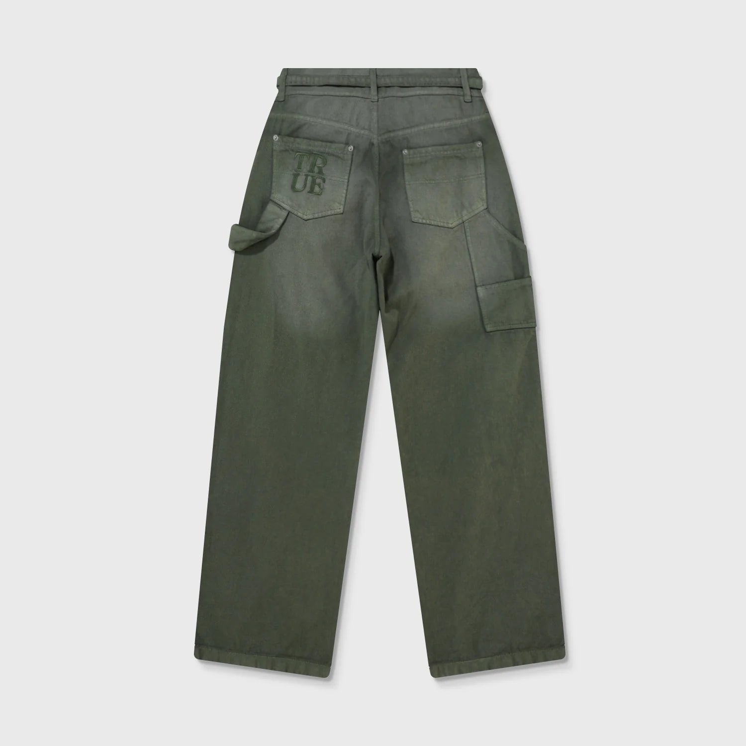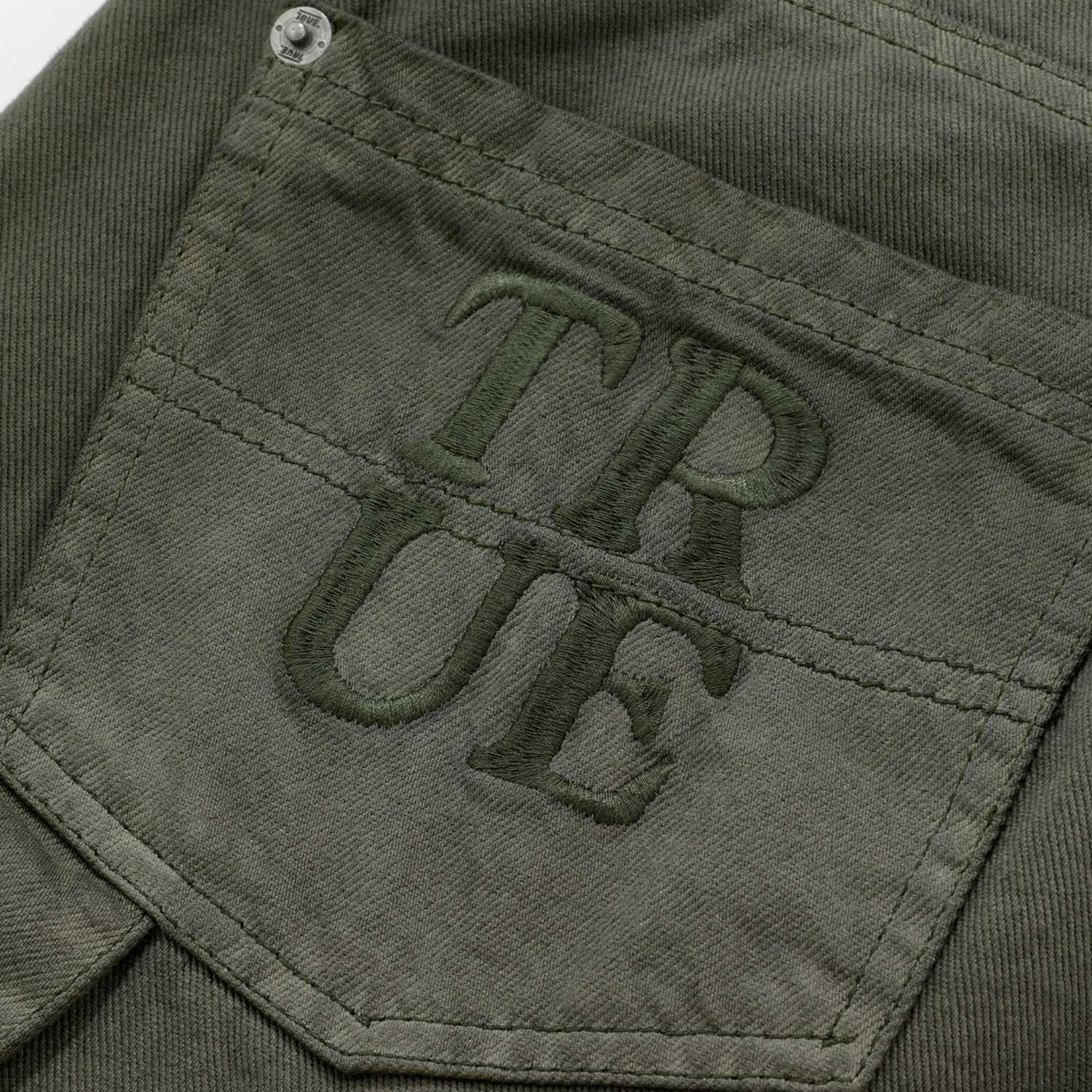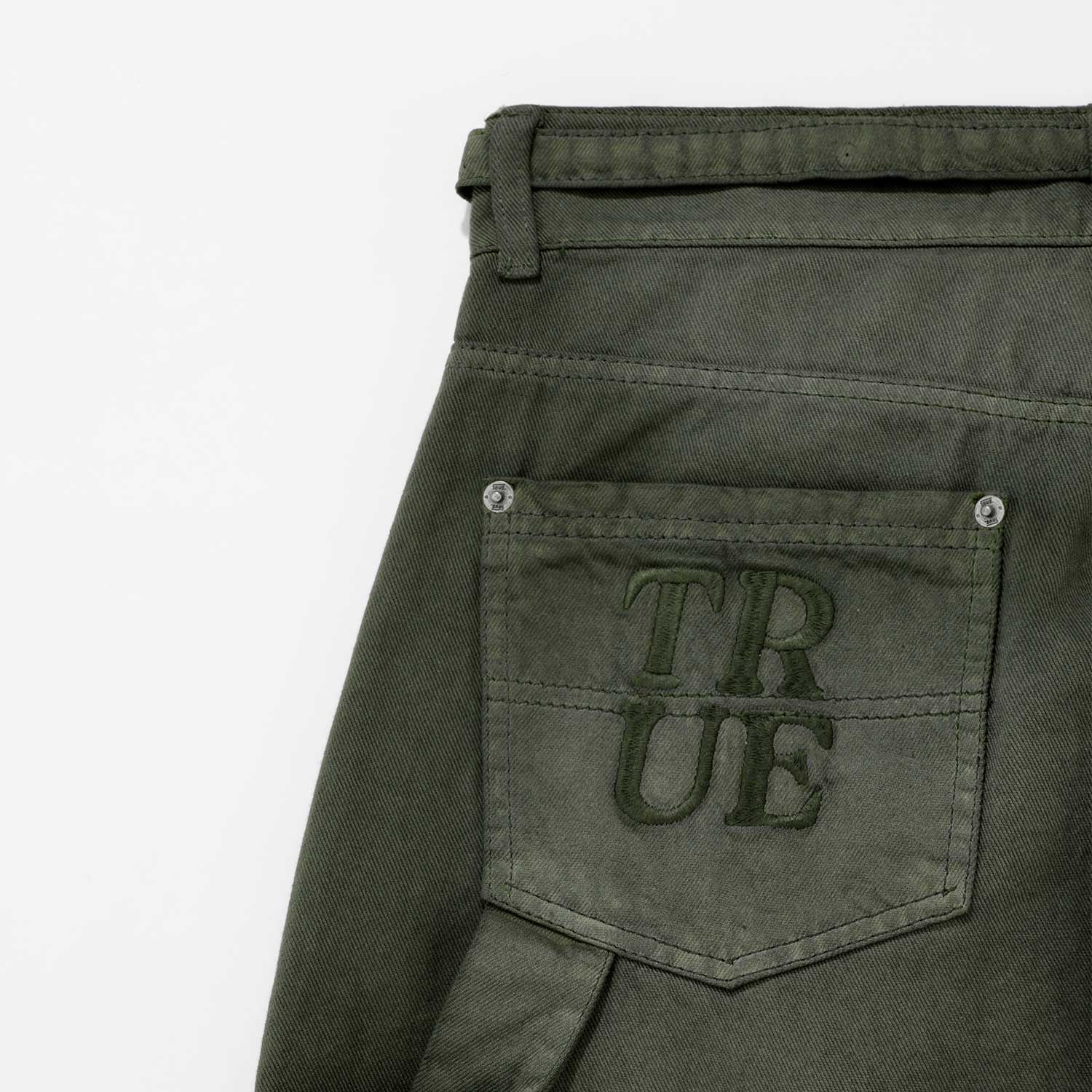 Pantalones verde militar con efecto desgastado en toda la prenda. Incluyen cordón en un lateral, bolsillos delanteros y dos bolsillos traseros, uno de ellos con el logo bordado. Los botones y remaches están marcados. Tiene tiro bajo.