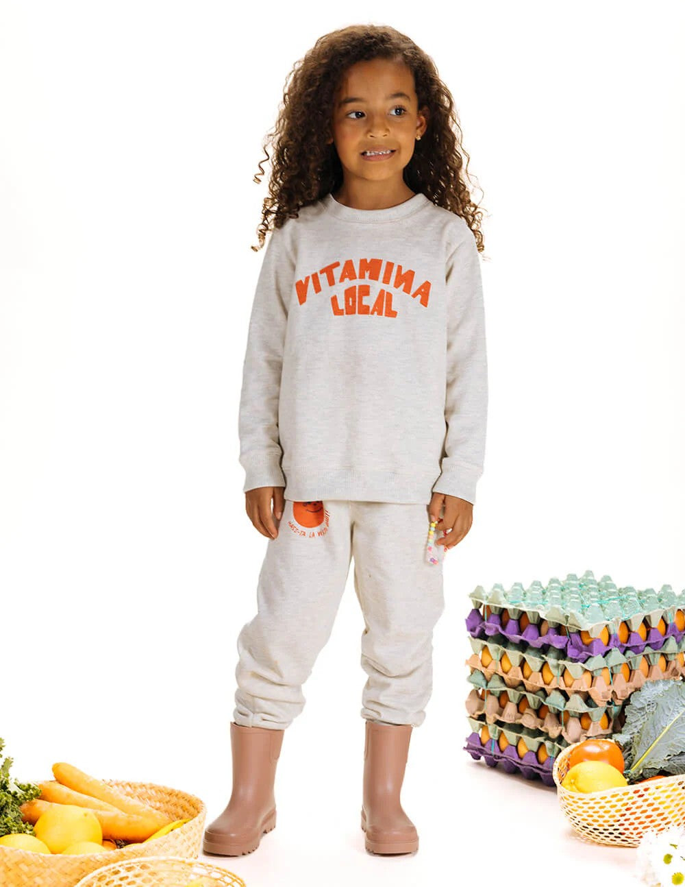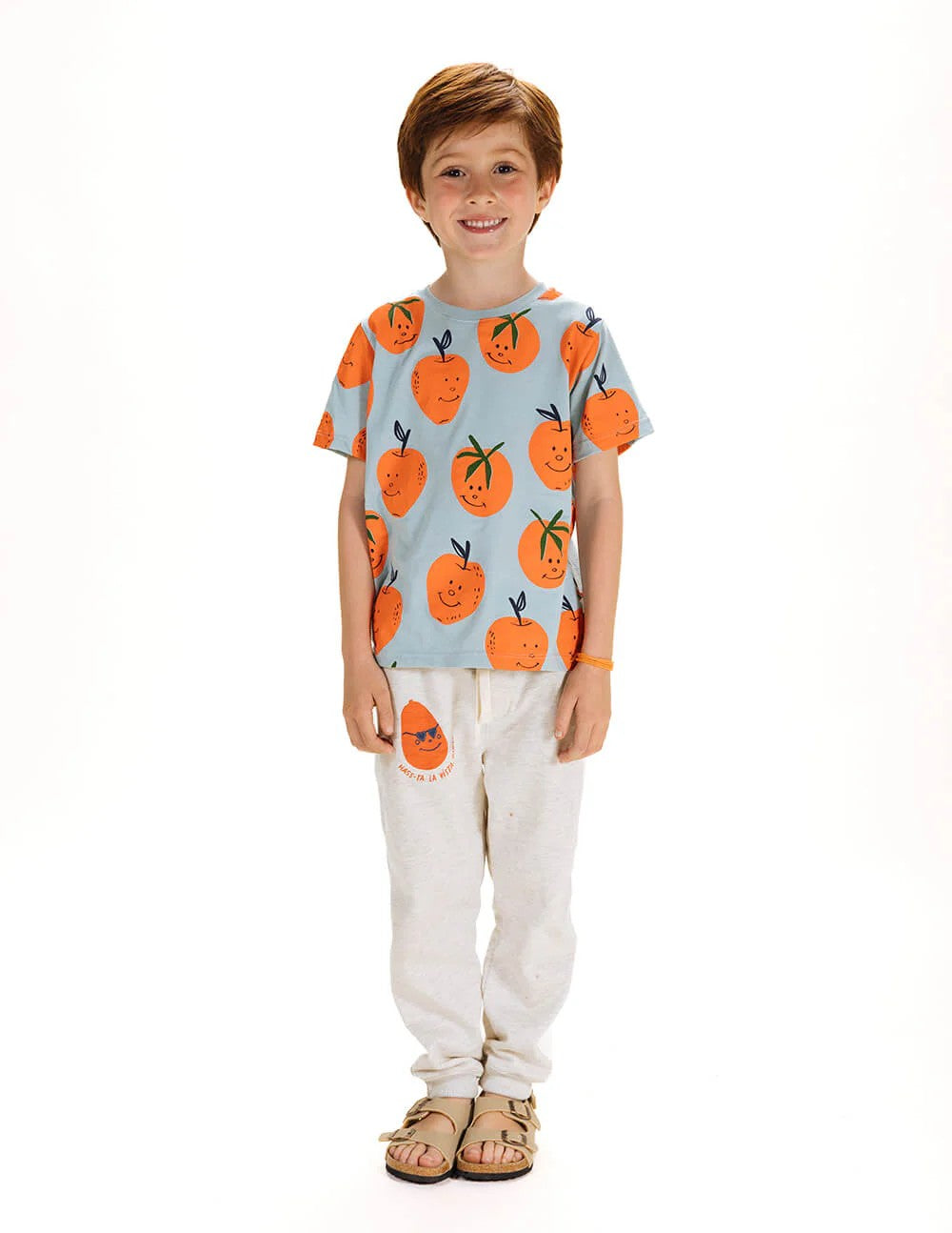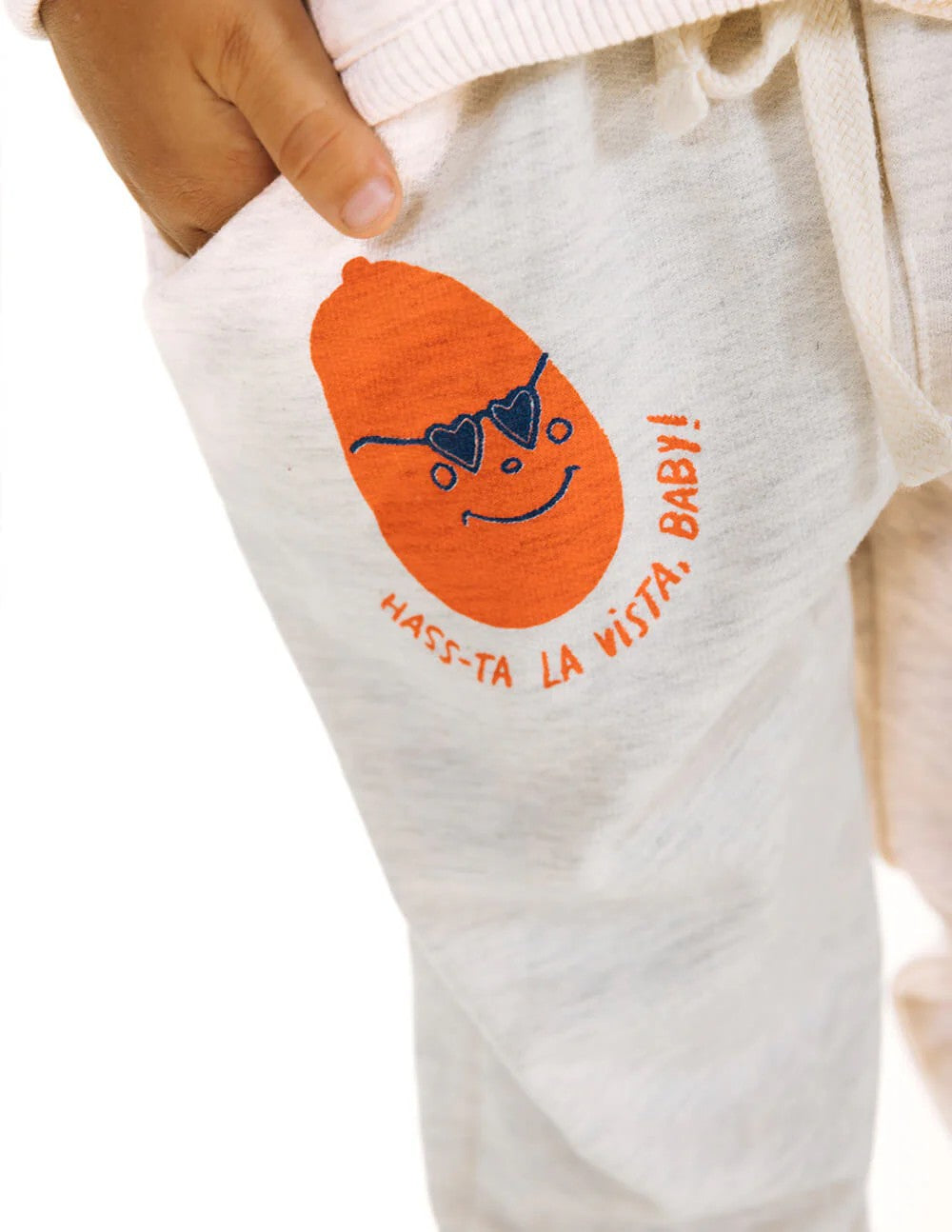 Pantalón unisex para niños con pretina elástica y cordón ajustable en la cintura. Con bolsillos laterales y estampado divertido de aguacate con frase "Hass-ta la vista, baby" en rojo coral sobre gris claro jaspe. Fabricados en tela deportiva perchada para mantener calidez y comodidad. Combínalos con nuestro buzo "Frescura Local" o cualquier prenda de nuestra colección infantil. Composición 100% Algodón.