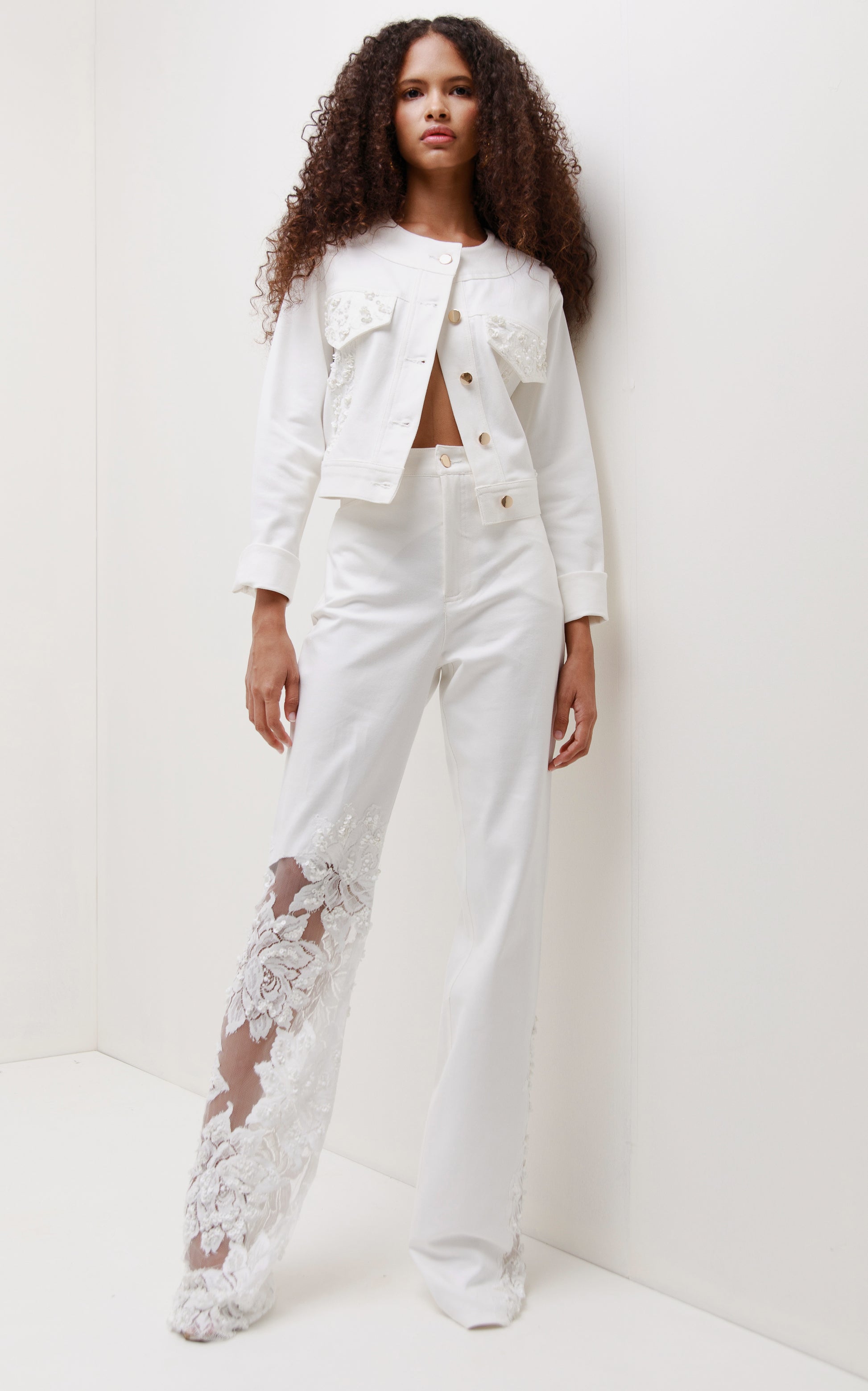Pantalón de corte recto y tiro alto, de color blanco. Lo más llamativo del diseño son los paneles laterales en las piernas, que comienzan aproximadamente desde la mitad del muslo y se extienden hasta el dobladillo. Estos paneles son transparentes y están adornados con apliques de encaje floral creando un efecto de "segunda piel" con detalles intrincados.
