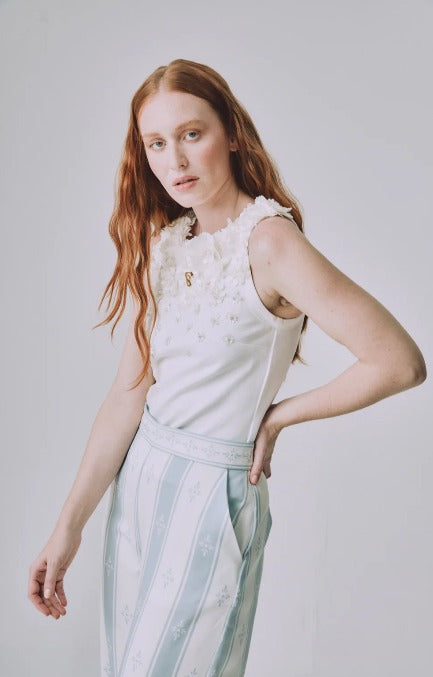 Con líneas verticales en azul suave y marfil, alargan la silueta a la vez que evocan serenidad. Ofrecen una caída fluida y una textura ligera que se mueve con gracia a cada paso.