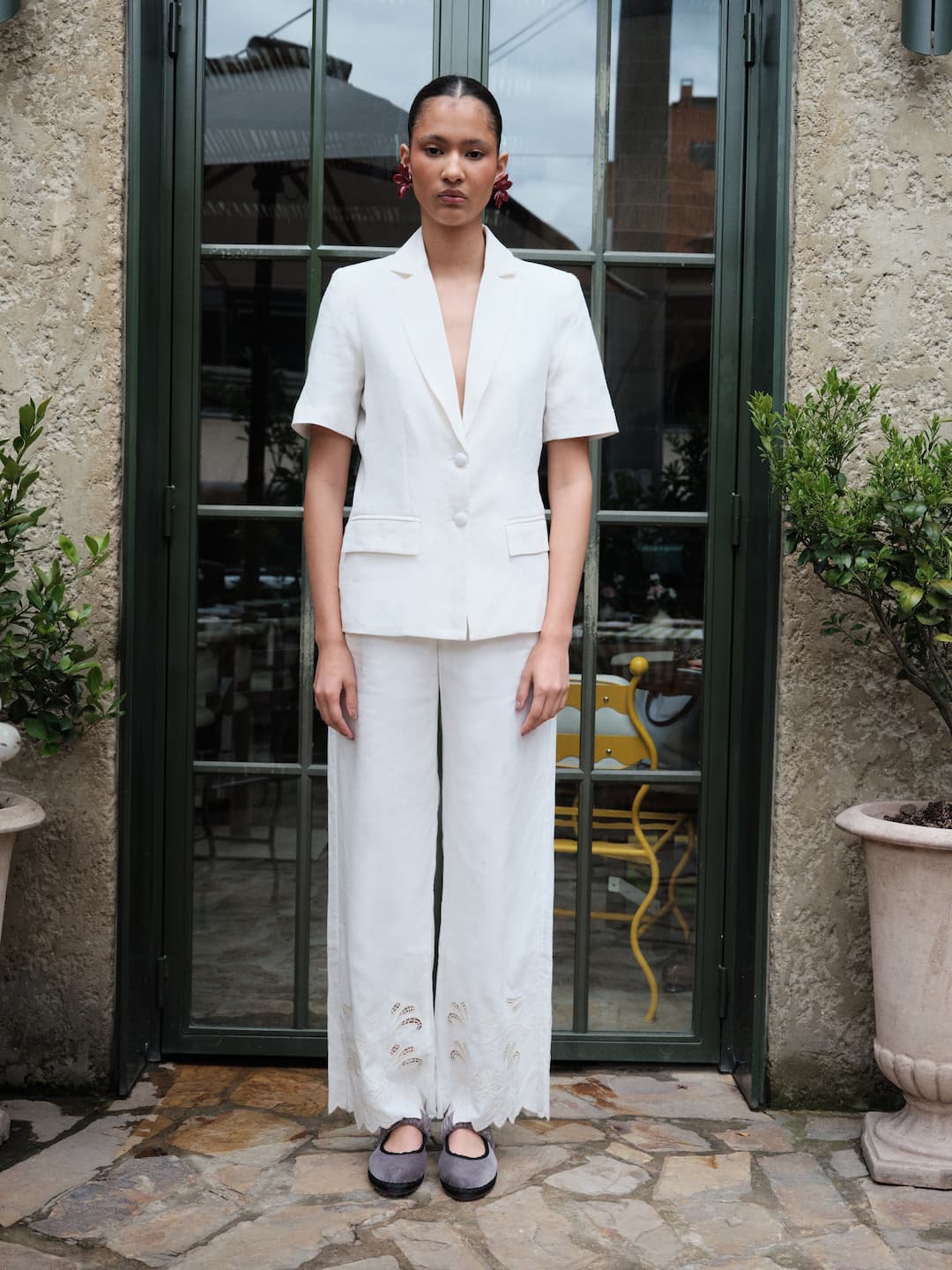 Pantalón tiro alto con una silueta de bota ancha que combina comodidad y elegancia sastrera. Presenta una pretina con trabillas y cierre de botón a tono, complementada con bolsillos laterales de corte curvo que aportan un aire relajado. El detalle más distintivo se encuentra en el bajo, que luce un delicado bordado calado con motivos florales y un acabado festoneado en ondas, elevando la prenda a una pieza de diseño artesanal y sofisticado.