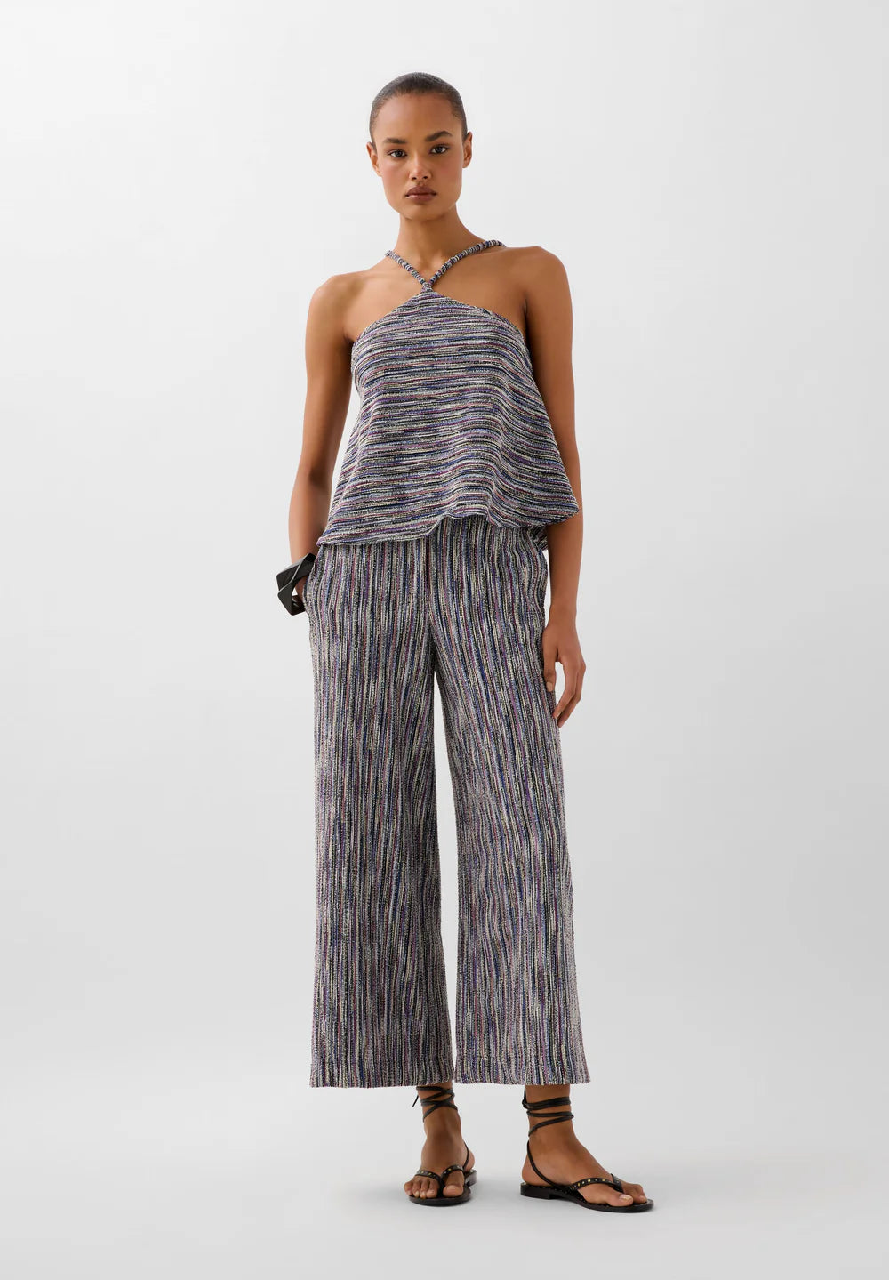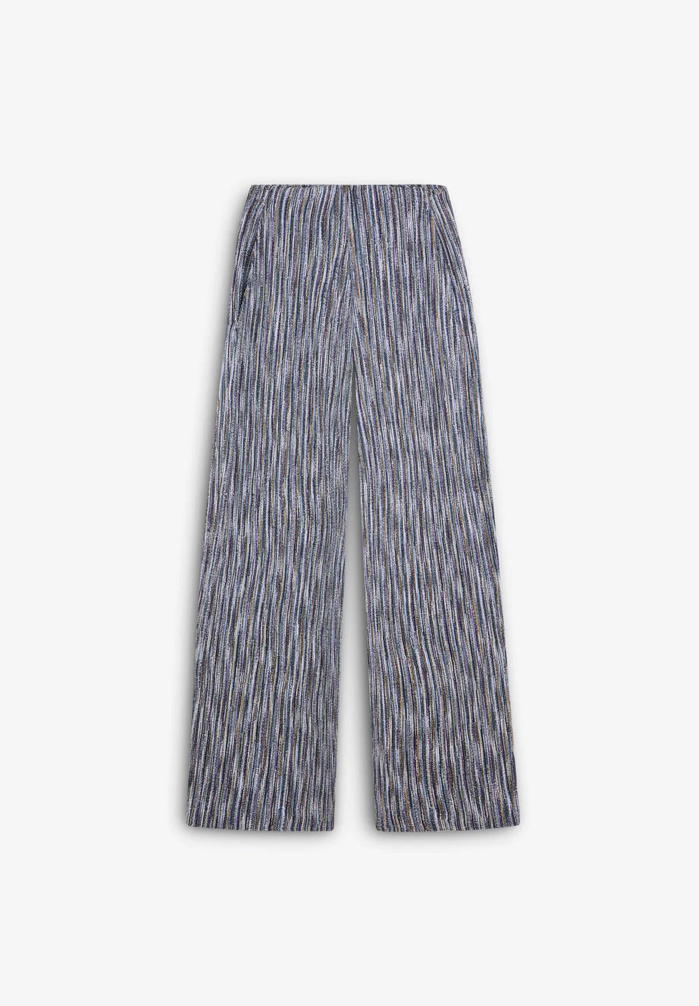 Pantalón de punto de algodón. Dos bolsillos laterales y dos traseros. Cierre frontal con botones ocultos y cremallera. Pernera ancha.