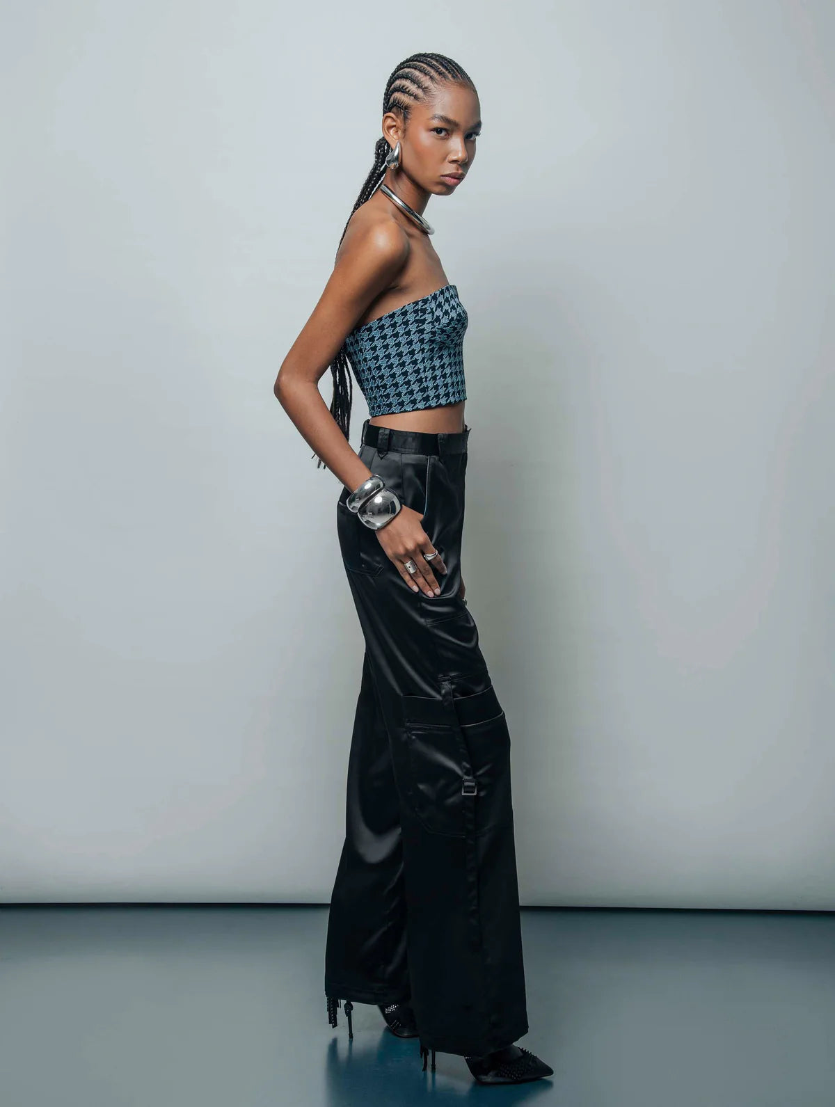 SOLARI. Pantalones cargo de corte relajado y tiro medio, confeccionados en suave satén que fluye con naturalidad. Su silueta recta se realza con bolsillos de parche plisados, detalles en relieve y trabillas metálicas, mientras que la cinturilla cruzada con doble botón y trabillas le aporta un toque refinado. Con cierre de cremallera frontal y botón metálico, esta prenda es la fusión definitiva de practicidad y funcionalidad, redefinida en su forma más sofisticada. Con el logo CONSTELLATION bordado en hilo plateado en la parte central delantera, captura una esencia audaz y sin género.