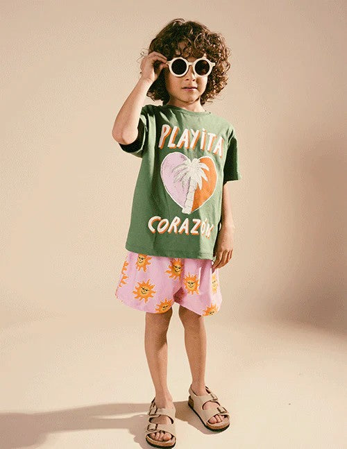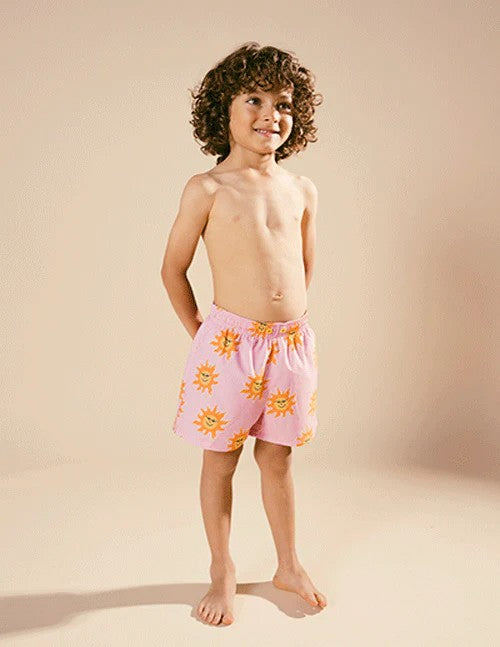 Pantaloneta de baño para niño confeccionada en la tela más suave del verano. Presenta una cintura elástica ajustable mediante cordón para un ajuste perfecto. Además, cuenta con un práctico bolsillo trasero. Su diseño destaca por un estampado soleado en vibrante amarillo sobre un fondo rosa claro, que sin duda añadirá un toque de diversión y frescura a las jornadas de playa o piscina de tu pequeño. Hecho éticamente en Colombia Composición: 100% Polyester