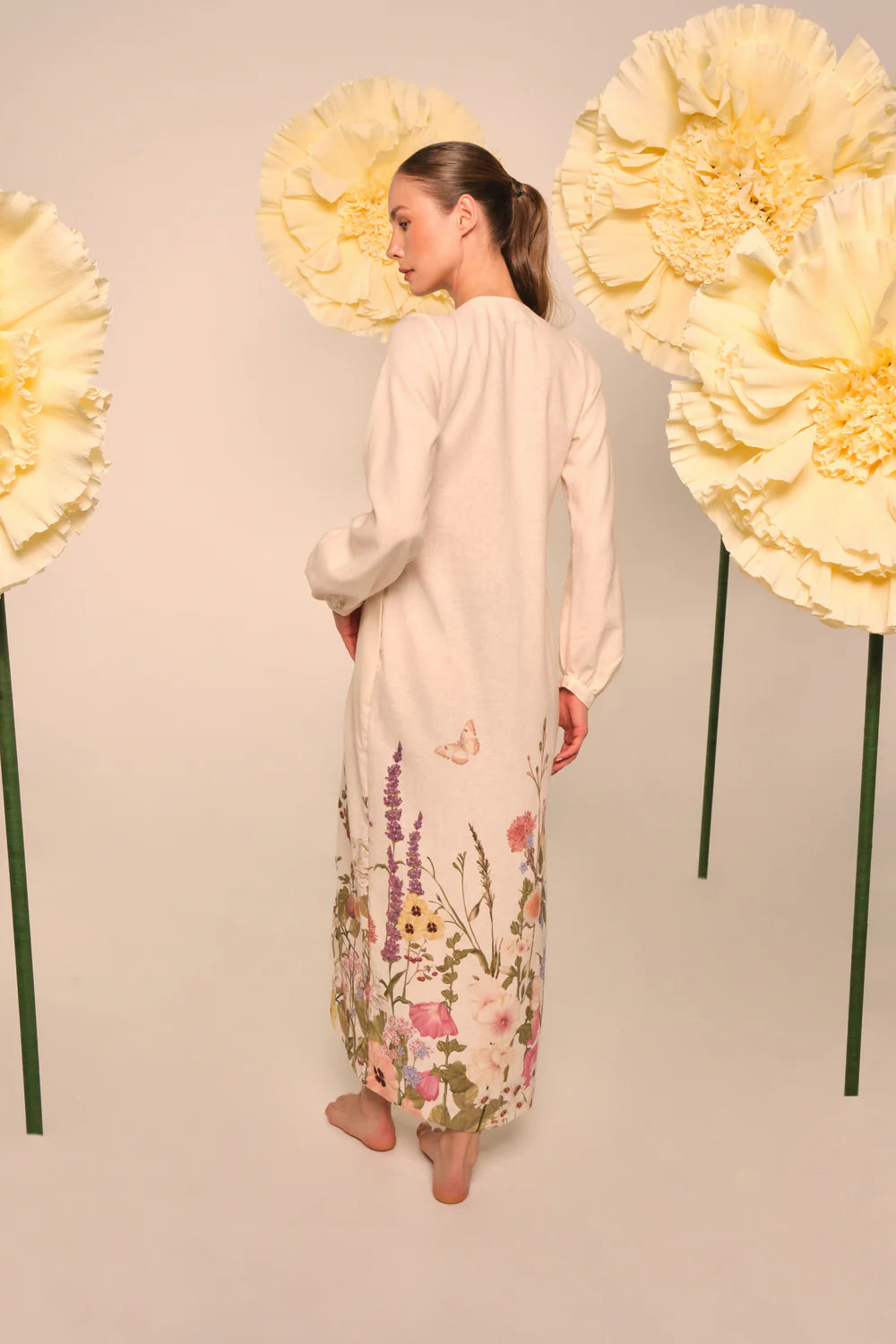 Un romántico pareo largo que se mueve con gracia y ligereza. El profundo escote en V y el lazo extragrande en la cintura crean una elegante silueta ceñida, mientras que las mangas abullonadas y el estampado botánico en el bajo le dan un toque de jardín de ensueño. Ligero y transpirable para días sin esfuerzo, desde la playa hasta la cena.