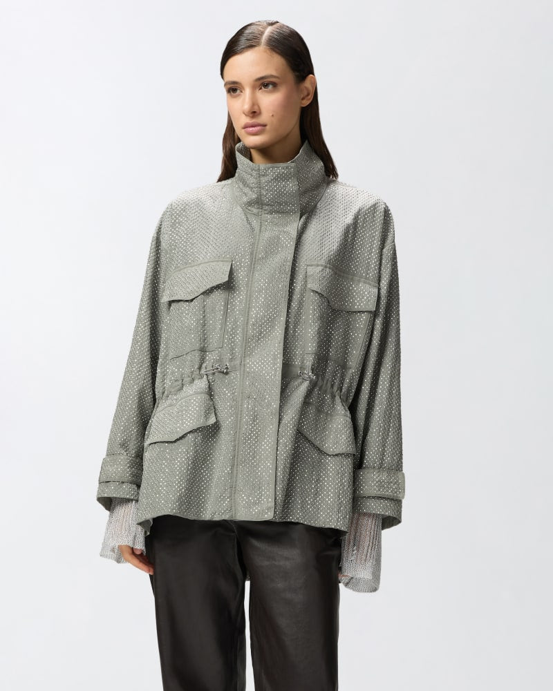 Parka de mujer hecha de lona técnica y tachonada por todas partes con pequeños tachuelas brillantes que parecen una lluvia de brillo. Esta parka presenta un cuello alto, mangas largas ligeramente bajas con lengüeta en el extremo y dos juegos de bolsillos de parche en la parte delantera. Esta prenda técnica de ropa exterior también tiene un cordón ajustable en la cintura para adaptar el ajuste y el forro interior. El cierre frontal está oculto por una solapa de longitud completa. Haga de los días lluviosos una ocasión especial para hacer alarde de esta parka, la prenda perfecta incluso para los días más cambiantes.