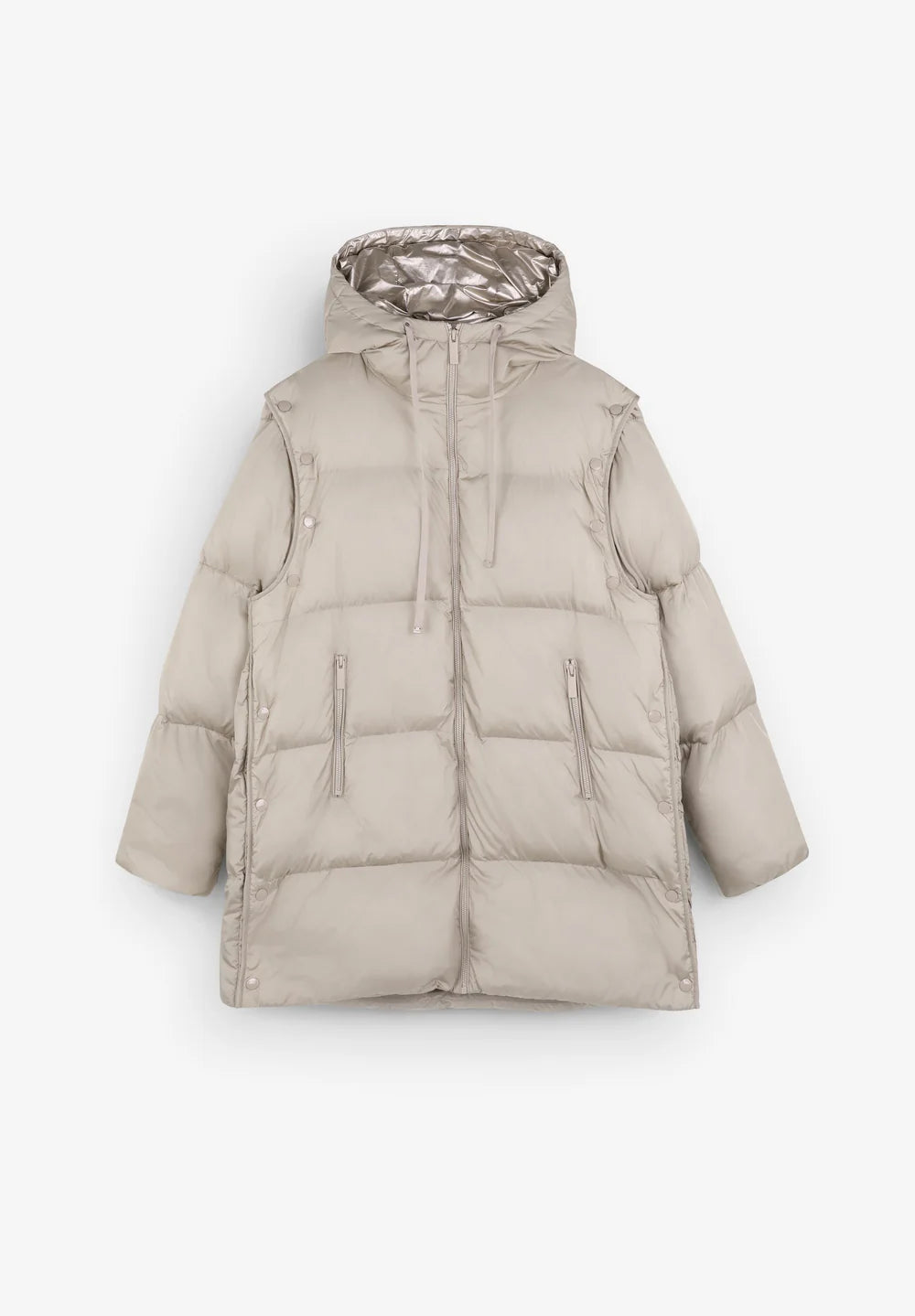 Chaqueta acolchada desmontable en chaleco confeccionada en 100% nylon reciclado. Corte Regular Fit, cuello con capucha ajustable con cordón. Cierre con cremallera. Mangas largas desmontables con snaps. Bolsillos laterales con cierre con cremallera.
