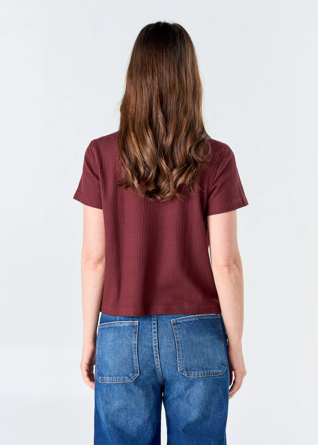 Camiseta tipo polo color burgundy en tela con textura "wafle", fit oversized.