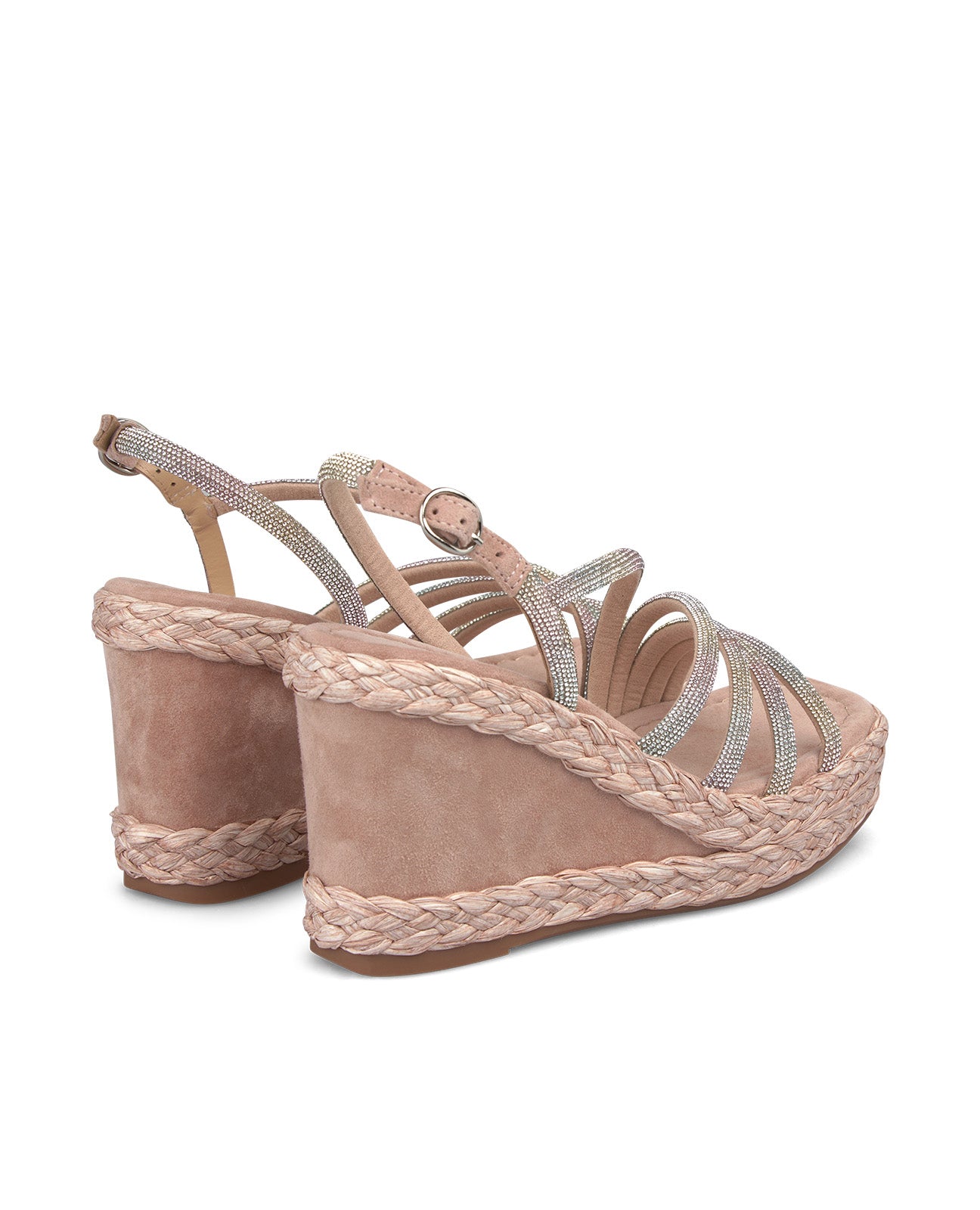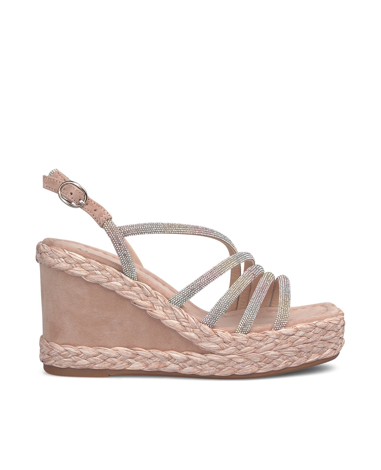Sandalia con cuña con trenzado y detalle de pedrería. Puntera cuadrada. Suela acolchada y cierre con hebilla