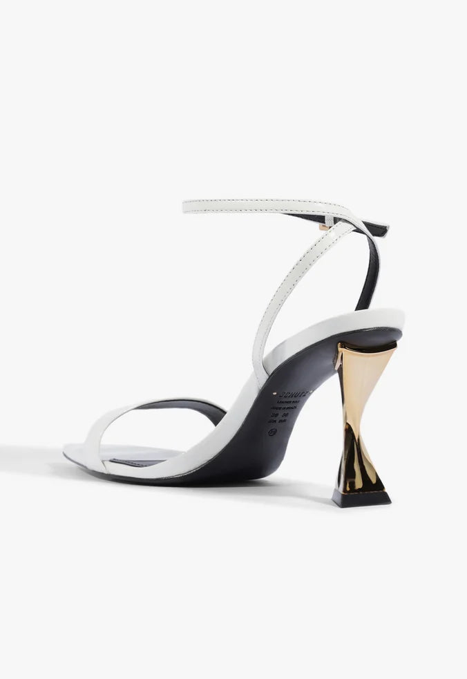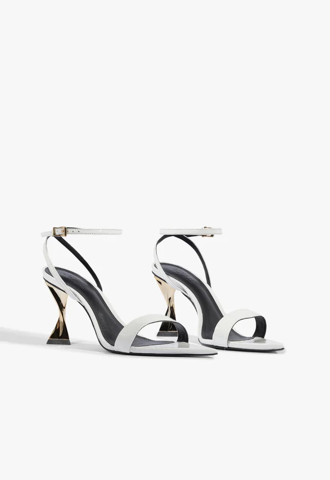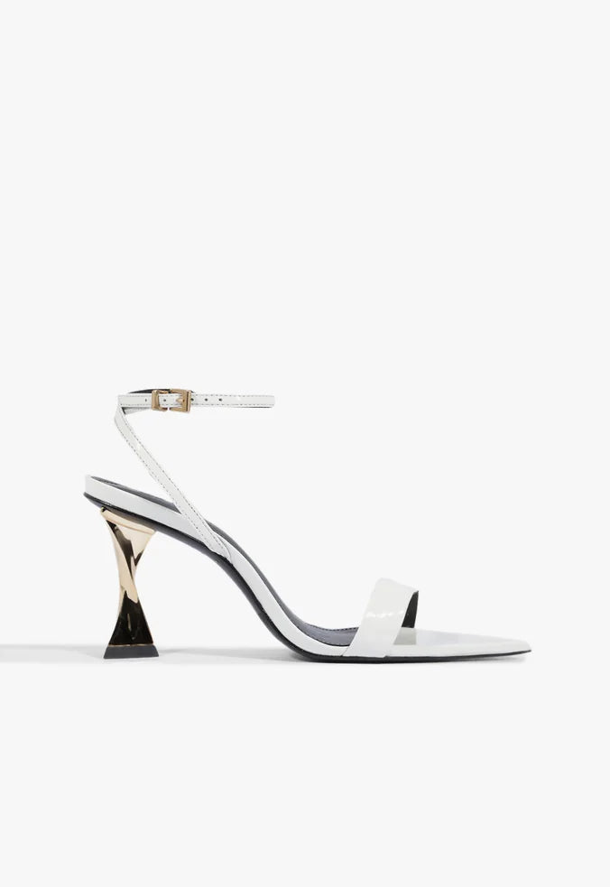 Esta sandalia es la definición de elegancia con carácter. Confeccionada en piel con acabado charol, posee el brillo justo para quienes buscan un toque de sofisticación. La tira única en el empeine es minimalista, mientras que la punta afilada le añade un encanto especial. El cierre de hebilla en el tobillo garantiza un ajuste perfecto, y el tacón alto geométrico metalizado aporta un gran impacto visual, creando un equilibrio perfecto entre lo clásico y lo moderno.