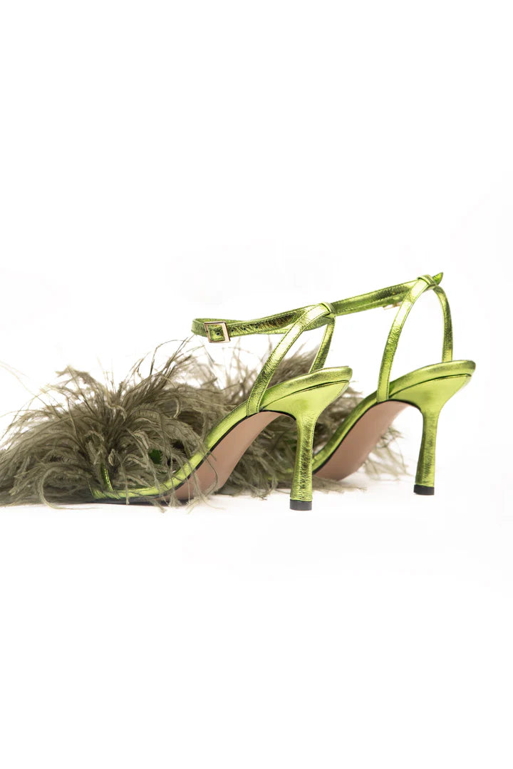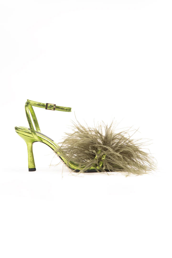 Material:Elaborada en cuero bovino folia metalizada Capellada con plumas de avestruz