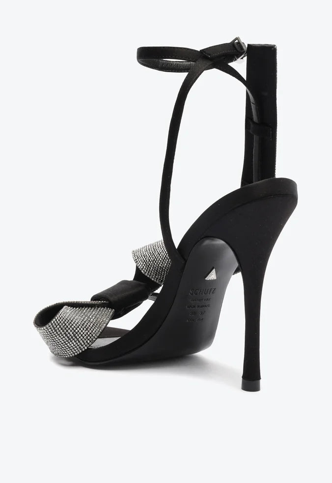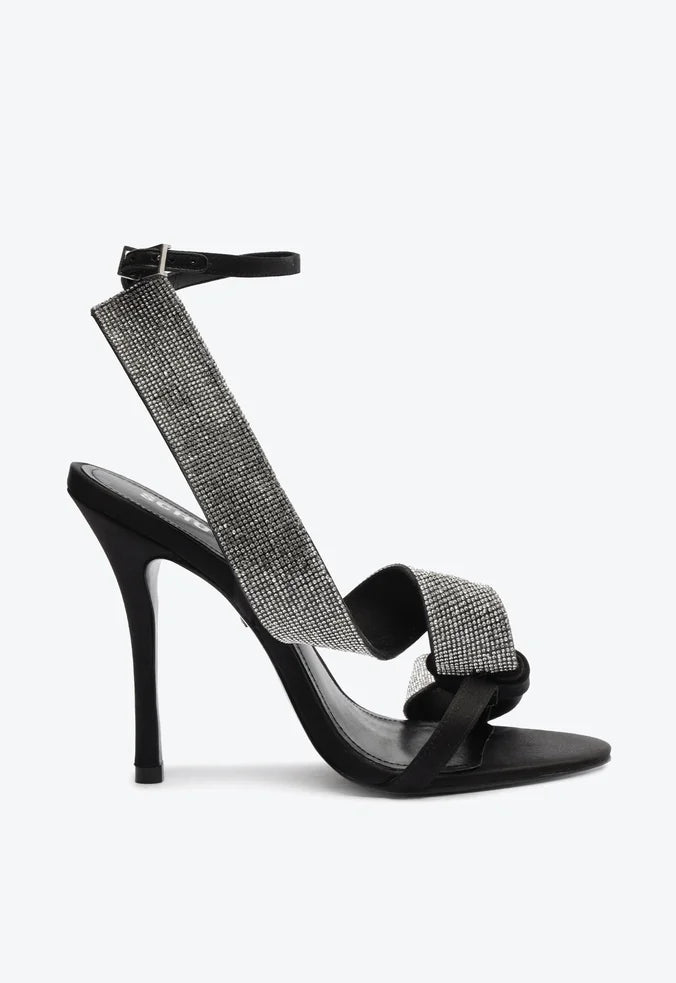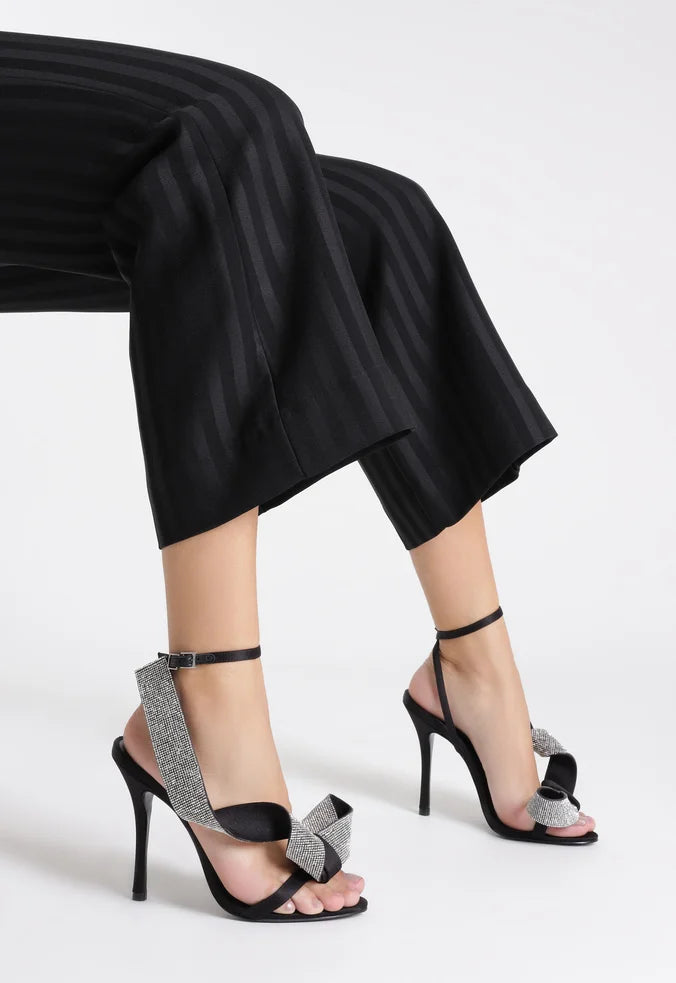 ¡Estas sandalias de tacón alto son puro glamour! El satén de piel les aporta un toque de sofisticación, mientras que el lazo maxi con pedrería garantiza un look impactante y ultrafemenino. ¡Prepárate para brillar!