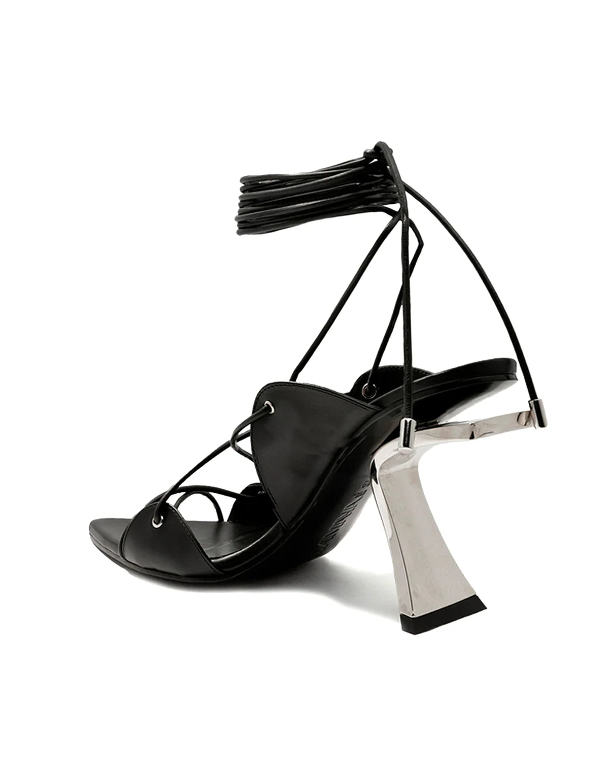 La sandalia Saico está hecha de piel de becerro napa. Su sistema de cordones inspirado en un corsé envuelve el pie y el tobillo para lograr una tensión y un ajuste regulables. La construcción abierta expone la estructura del pie mientras mantiene el agarre y el equilibrio. El diseño se completa con nuestro característico tacón curvo de 90 mm en acabado galvanizado.