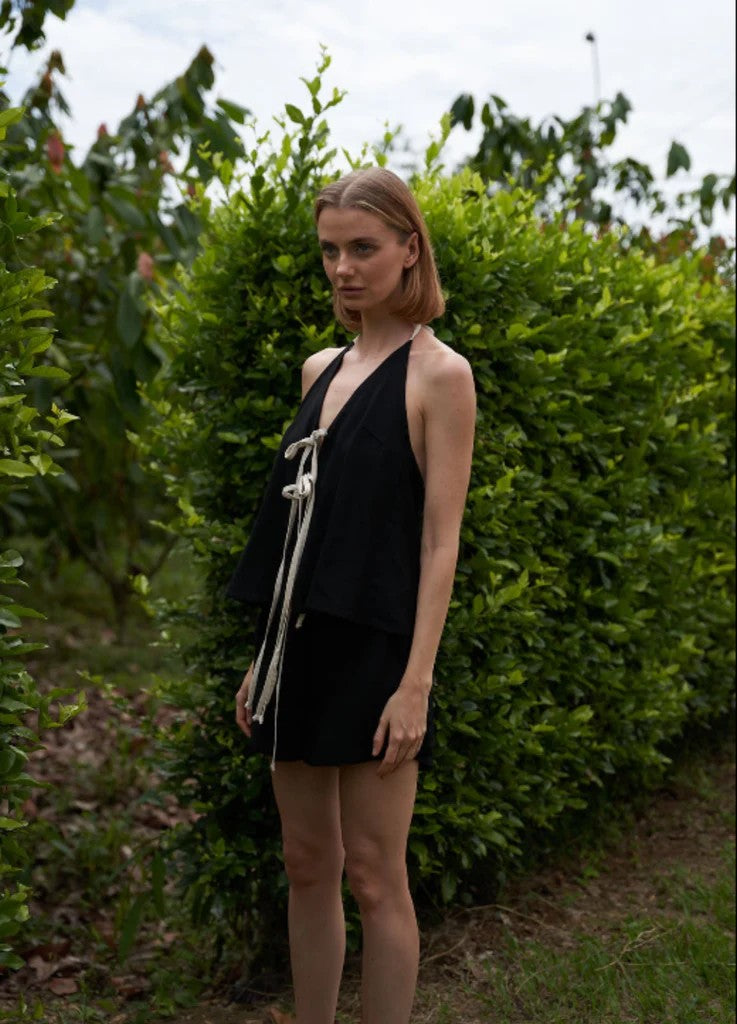 Conjunto de dos piezas que incluye una blusa de lino con escote en la espalda y un pantalón de suelto corto de lino. Este conjunto se caracteriza por su comodidad y estilo fresco, ideal para climas cálidos, gracias al material de lino.