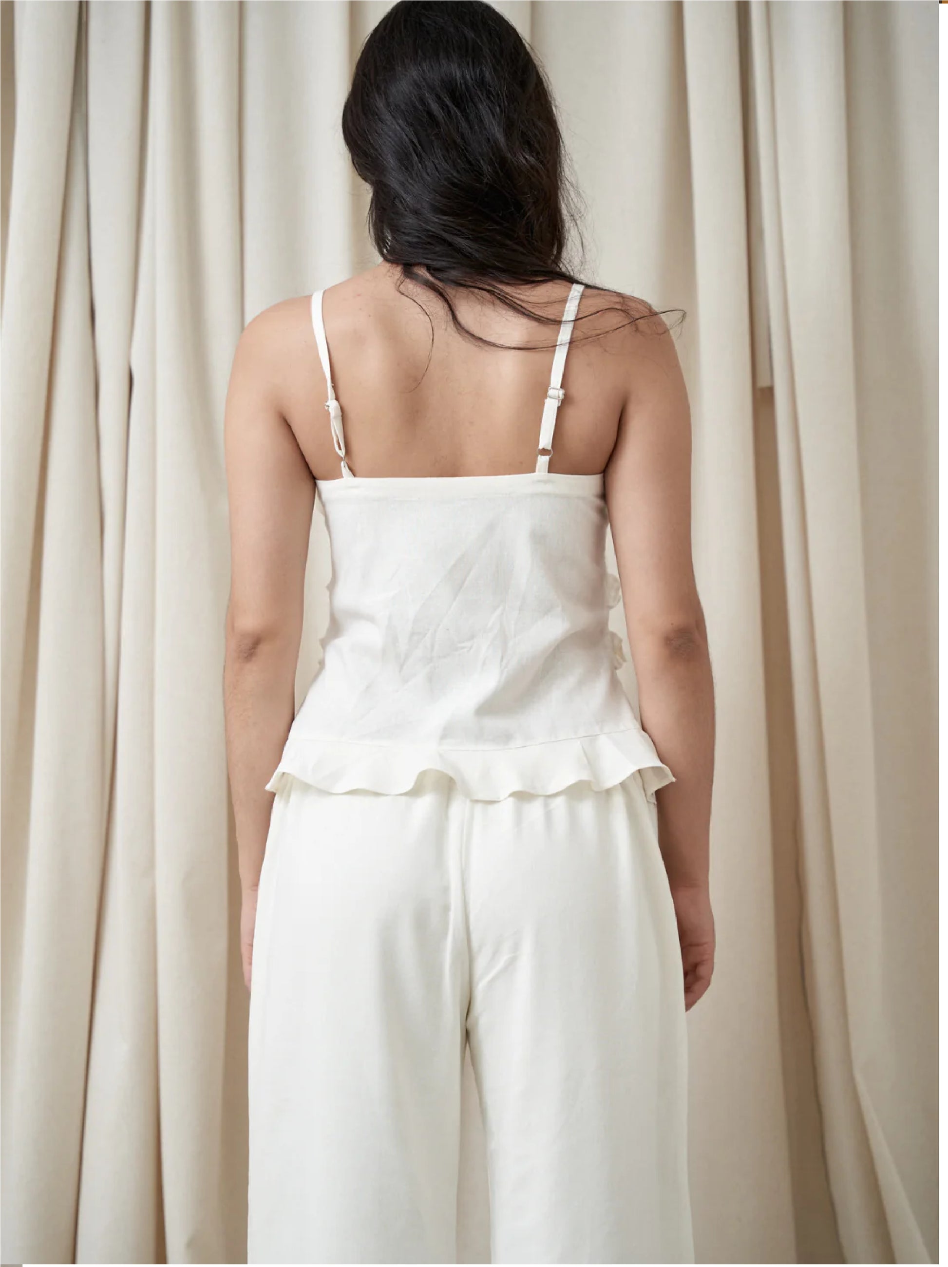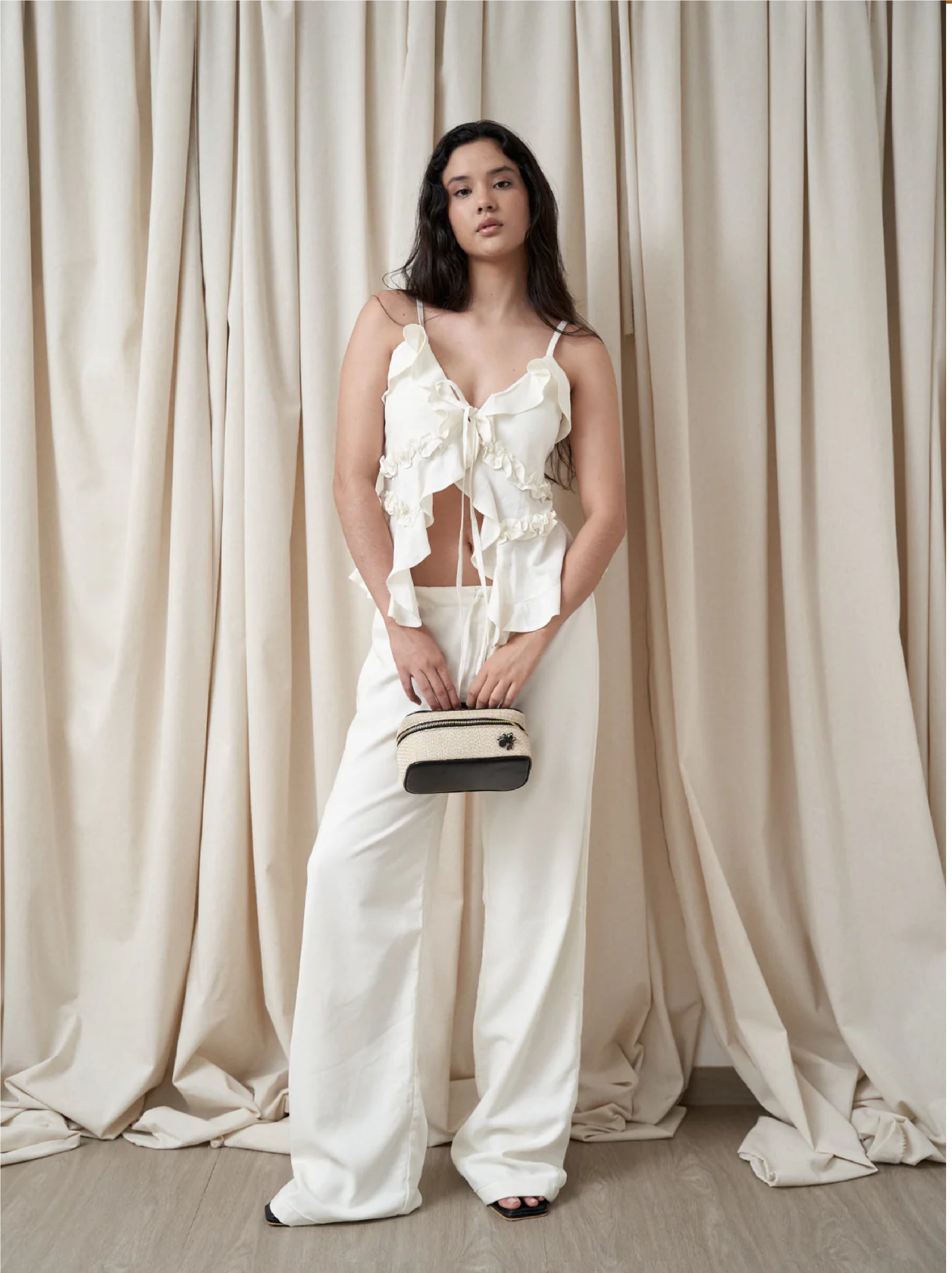 El Set Santander, su diseños único refleja la elegancia y comodidad de la mujer Matilda, con un pantalón a ala cintura encauchado lo hace ideal para cualquier tipo de cuerpo, y su blusa con boleros la esa ideal para cualquier ocasión. Set Santander esta fabricado en lino.