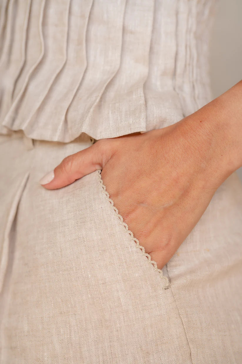 Shorts en 100% lino, bordados en bolsillo y ruedo, botón dorado.