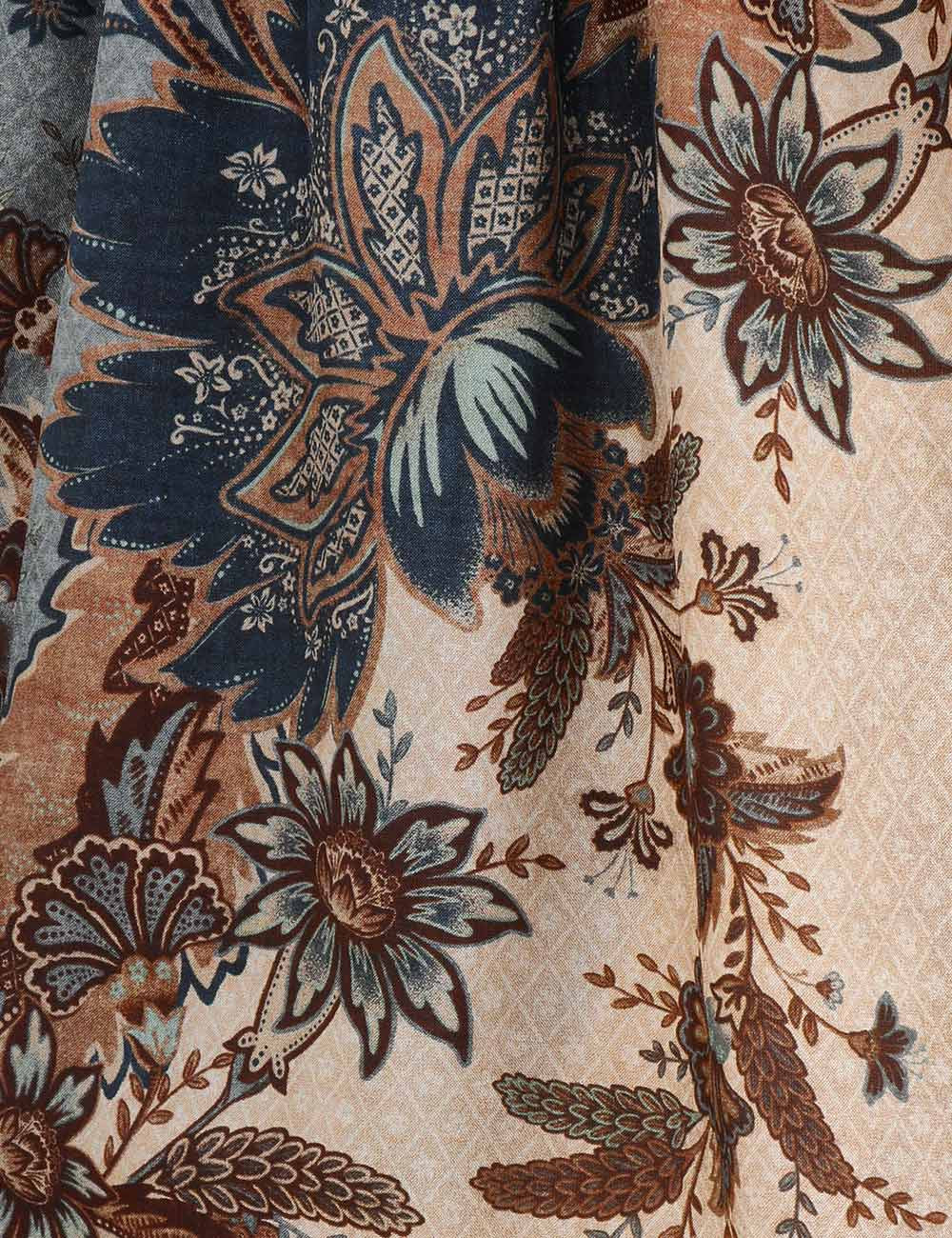Pantalones cortos holgados Ascension con estampado indiana floral azul y crema de nuestra Colección Playa 2025. Pantalones cortos de seda con cintura elástica, un llamativo estampado de colocación y bolsillos funcionales.