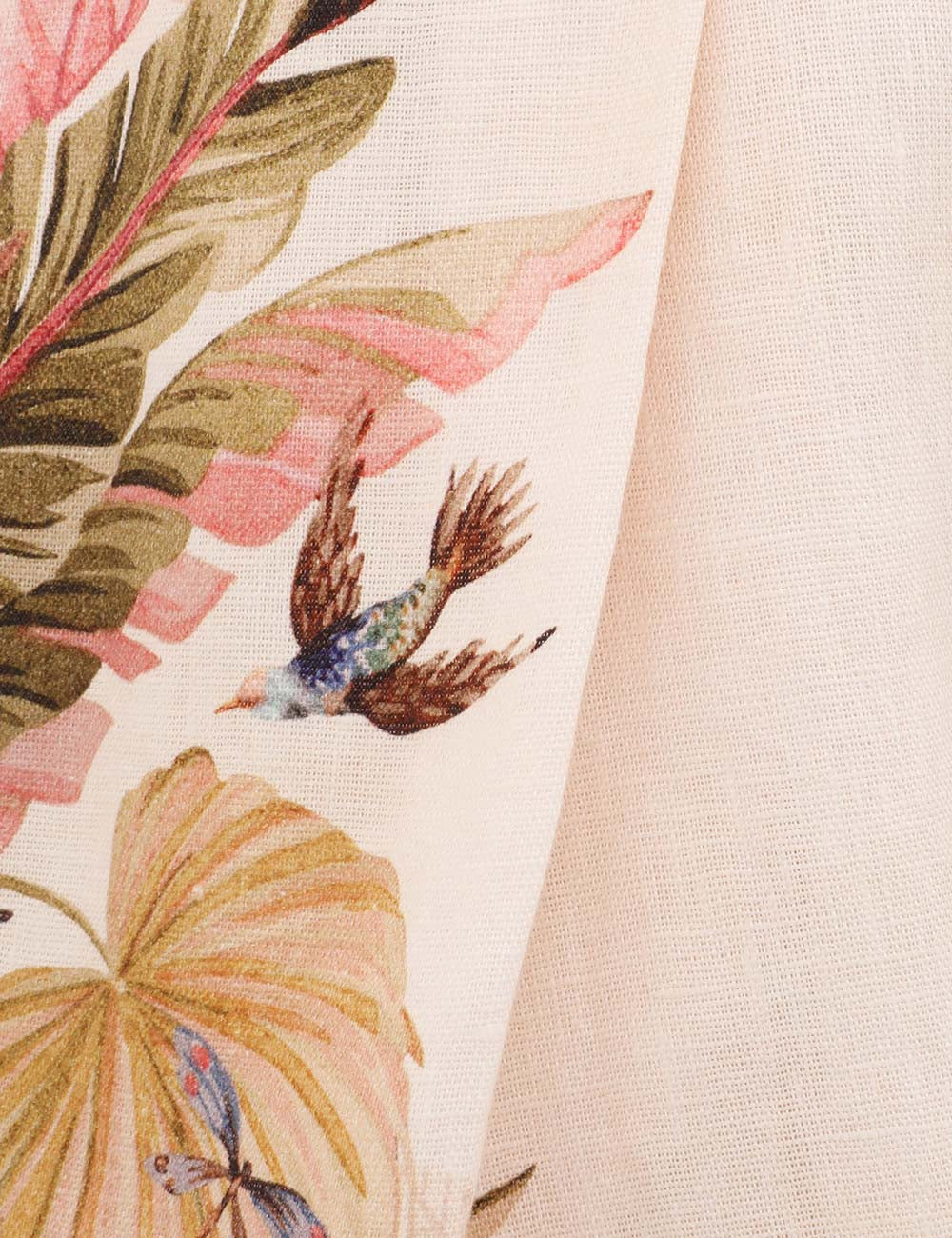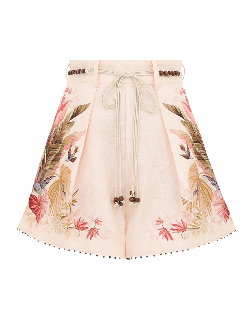 Pantalones cortos con pinzas Ascension en color crema palmera floral de nuestra Colección Playa 2025. Pantalones cortos de cintura alta de lino con cinturón de cuentas de madera, bolsillos laterales funcionales, detalle de cuentas en el dobladillo y cierre de cremallera invisible en la parte posterior.
