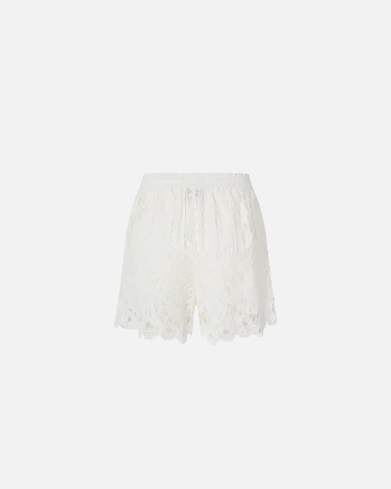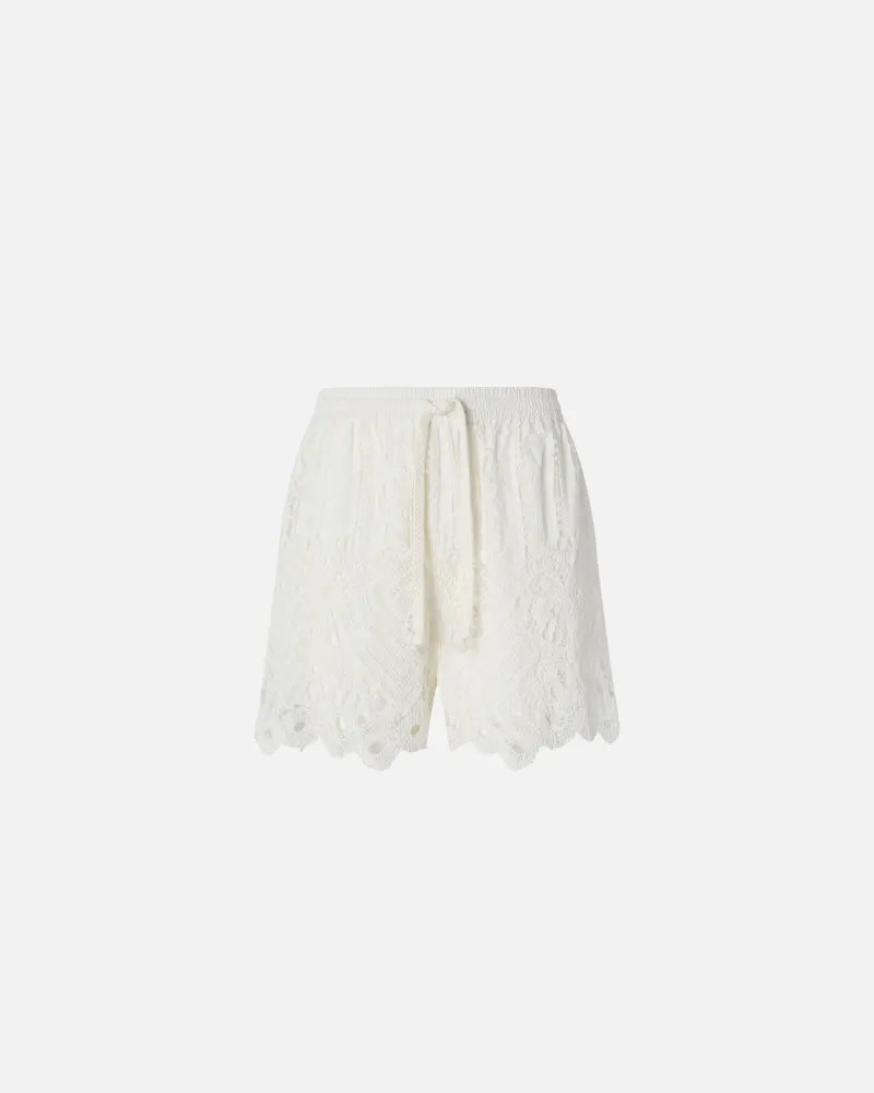 Shorts de día en refinado encaje bordado inglés con detalles de macramé, que crean un efecto calado especial que se extiende a lo largo de la pierna hasta los bajos festoneados. Estos shorts veraniegos para mujer incorporan un forro interior de algodón que compensa las transparencias del material perforado y proporciona una sensación de frescor en la piel. La cintura alta con entrepierna relajada, la banda elástica y el cordón ajustable garantizan un ajuste perfecto.