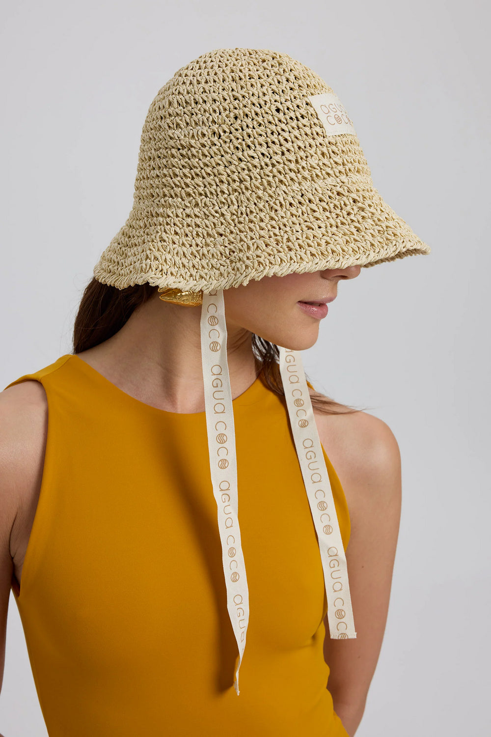 Sombrero de pescador con ala trenzada y detalles de lazos laterales.