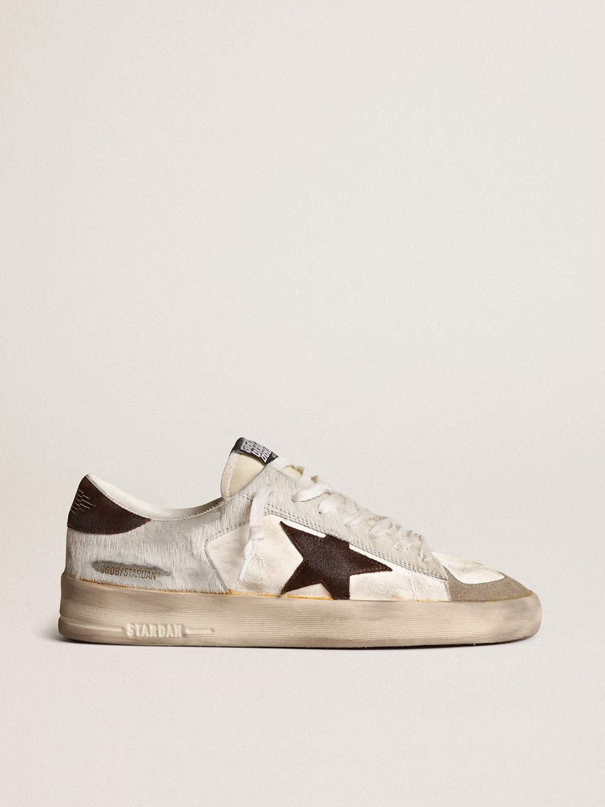 Los gloriosos noventa envueltos en una zapatilla. Las zapatillas Stardan rinden homenaje a los iconos del baloncesto de esa década, sin perder de vista el presente. En esta versión para hombre, el empeine de piel de napa color crema acentuado con aplicaciones de piel de potro blanca presenta una estrella y un refuerzo del talón de ante marrón. La puntera de ante color gris paloma y los cordones blancos añaden el toque final.