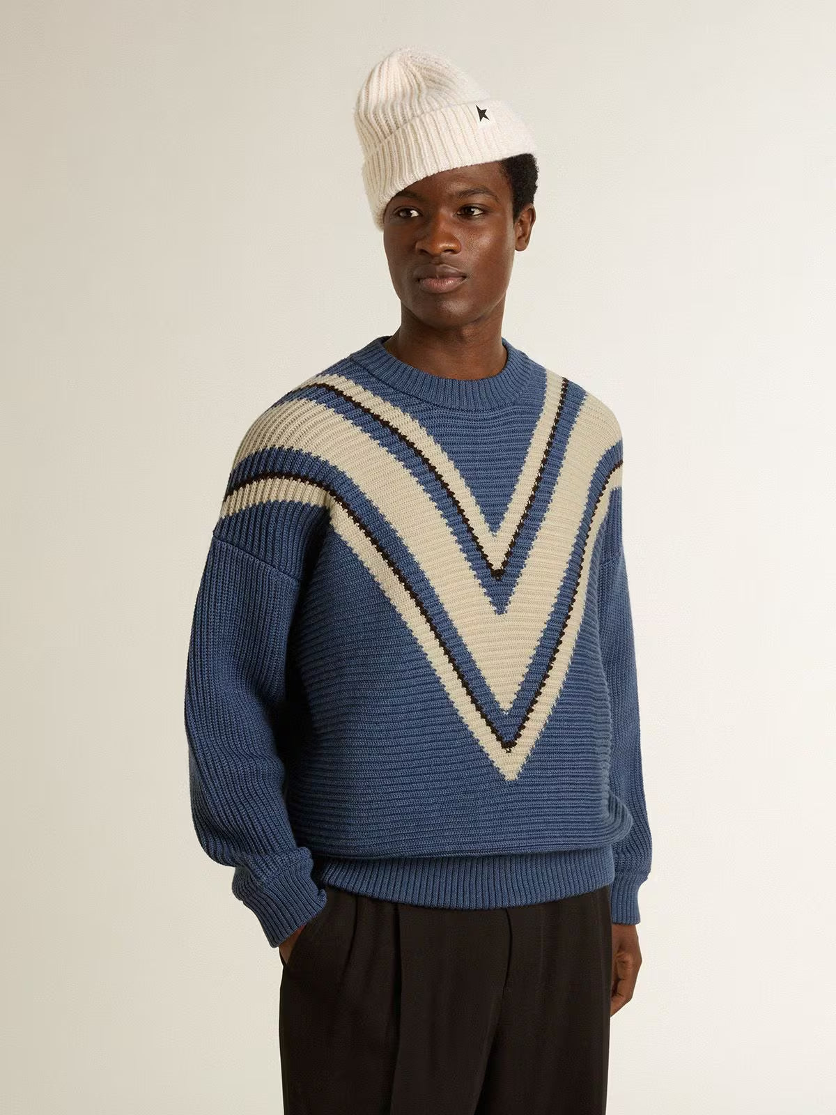 La segunda entrega de la colección Otoño/Invierno 25 se despliega como un viaje relajado y refrescante, tejido en la tela de cada prenda. En azul claro, este suéter de lana jacquard para hombre presenta un estampado crema con bordes negros. Los bordes acanalados y las dos estrellas en la espalda le dan el toque final.