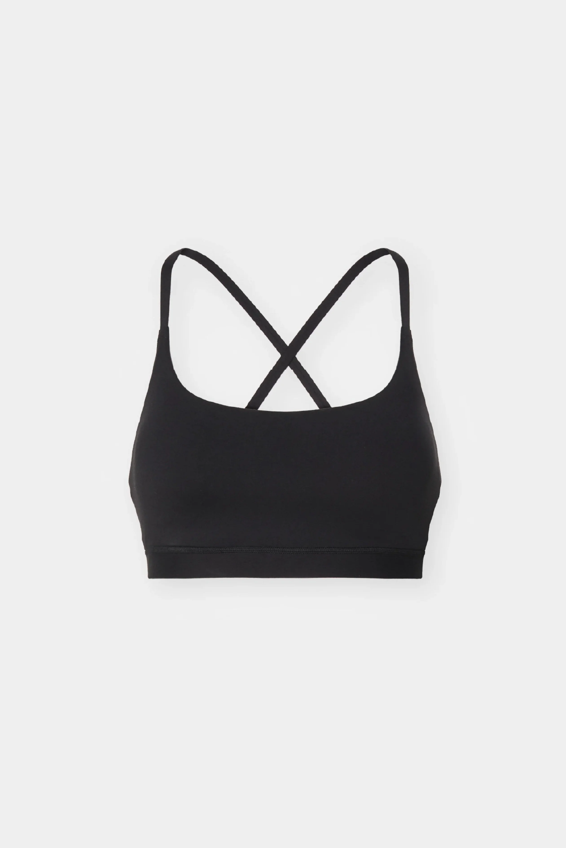 Sujetador deportivo con sujeción ligera. El tejido Adisoft es liso, suave y brinda soporte. Las almohadillas extraíbles con puntos de agarre permanecen en su lugar mientras realizas las posturas. Inspirado en el ballet, el diseño de tiras tiene un aspecto femenino.