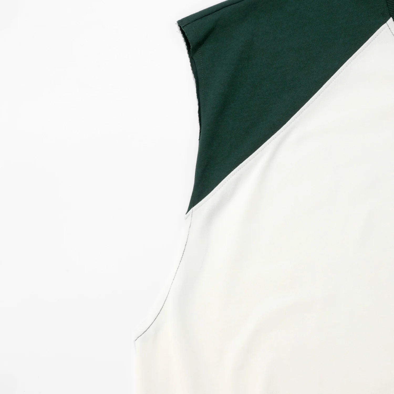 T-Shirt manga sisa blanca con diseño raglán en verde pino. Tiene un estampado adelante en alta densidad, está hecho en 100% algodón pesado y su silueta es Boxy.