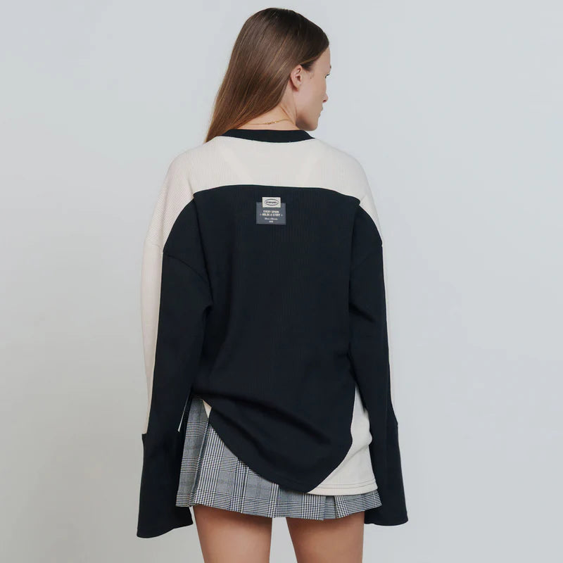 Camiseta negra con hombros y laterales inferiores color crema, manga larga y silueta oversized. Viene con el logo estampado adelante en alta densidad.