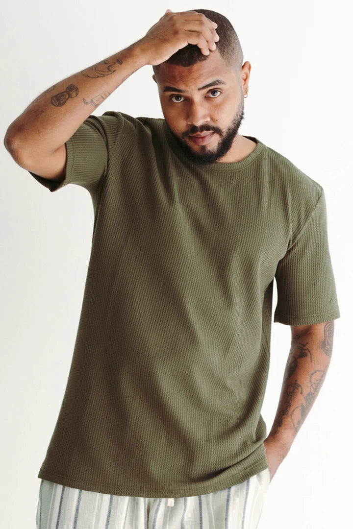 T-Shirt básica cuello redondo en algodón wafer verde oliva. Esta camiseta por el tipo de algodón que usamos es especialmente fresca y cómoda. Es la prenda perfecta para usar en capas, con una camisa encima, un saco o una chaqueta.