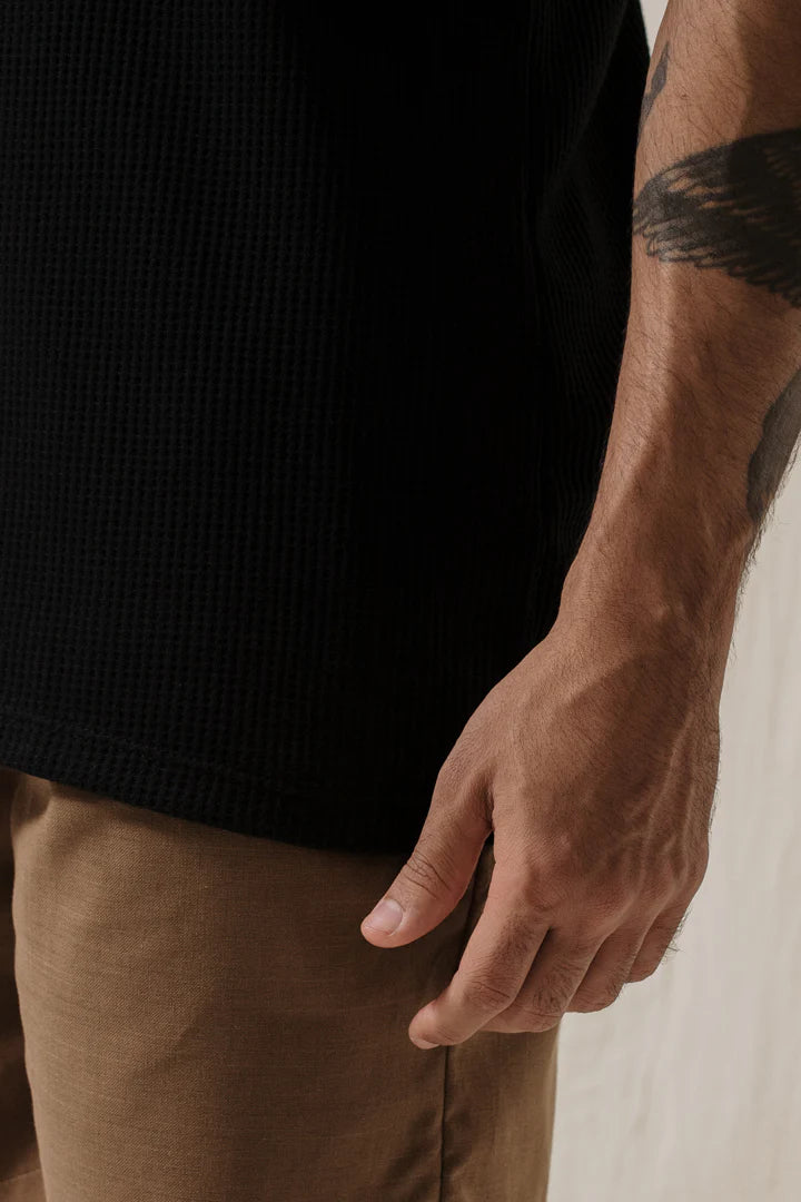 T-Shirt básica cuello redondo en algodón wafer negro. Esta camiseta por el tipo de algodón que usamos es especialmente fresca y cómoda. Es la prenda perfecta para usar en capas, con una camisa encima, un saco o una chaqueta.