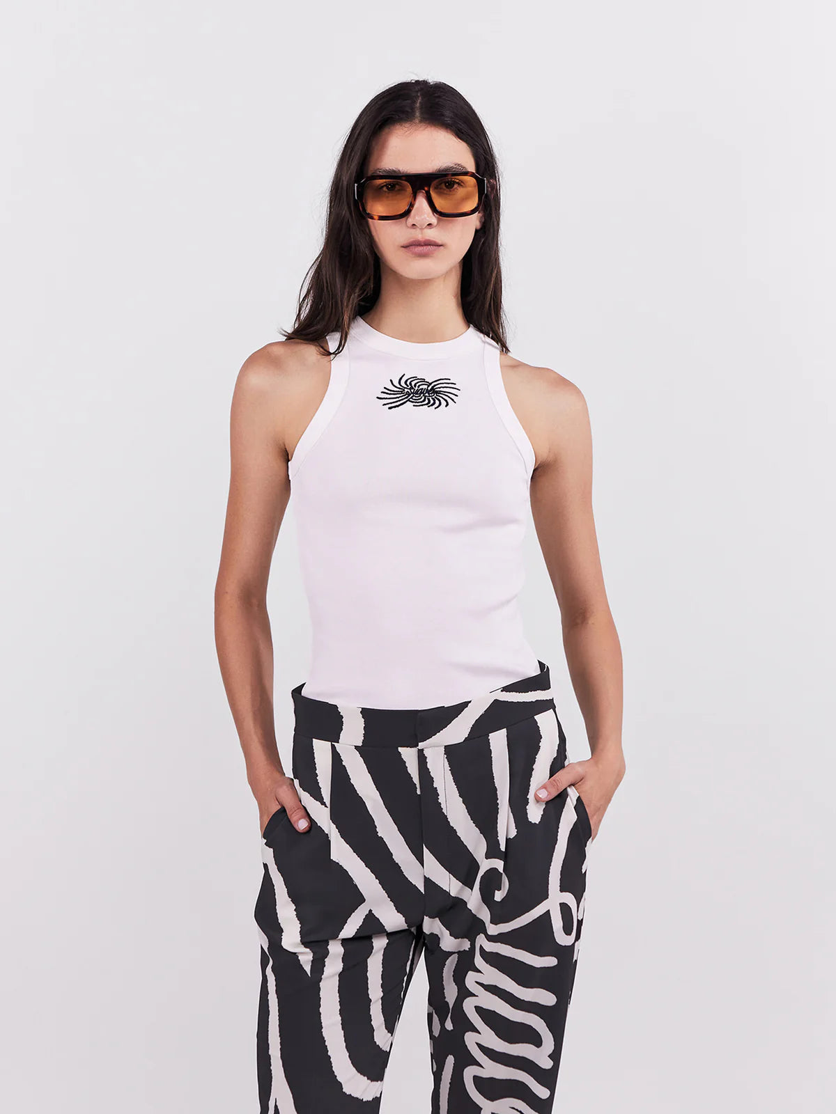 Diseño sin mangas. Gráfico bordado en el pecho. Ajuste elástico.