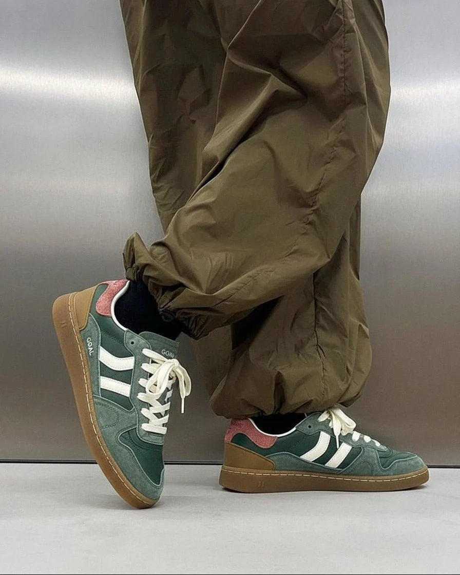 Tenis de ante con detalles en color contrastante. Lengüeta de piel preformada con acolchado anatómico. Ribetes de piel en el forro. Cordones planos de algodón bicolor intercambiables. Cuello ligeramente acolchado. Refuerzo cosido en la parte delantera. Suela de goma flexible que proporciona durabilidad y agarre. El nombre del modelo «GOAL» aparece en el lateral en dorado envejecido.