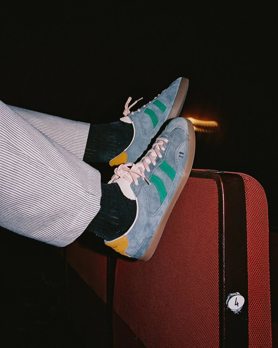 Tenis deportivas bajas de piel tipo serraje. Corte sencillo y clásico con cierre de cordones. La pieza de talón y el logo contrastan tanto por color como por textura. La plantilla de foam acolchada lleva impreso un diseño multilogo. El forro de piel contrasta en la parte trasera siguiendo el tono del corte. La suela de goma ligera en colores miel lleva un pespunte en la base que refuerza la unión entre el corte y la misma suela.