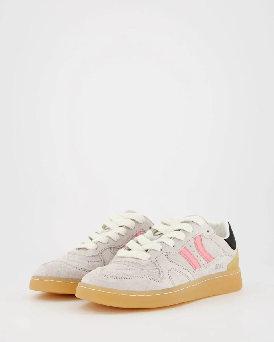 Tenis deportiva de serraje con detalles en contraste de color. Lengüeta de piel y preformada con un acolchado figurado. Vistas del forro en piel. Cordones planos de algodón en dos tonos intercambiables. Cuello ligeramente acolchado. La parte delantera lleva un refuerzo de pespuntes. Suela flexible de goma/caucho que aporta durabilidad y agarre. Cuenta con el nombre del modelo “GOAL” en lateral en oro viejo.