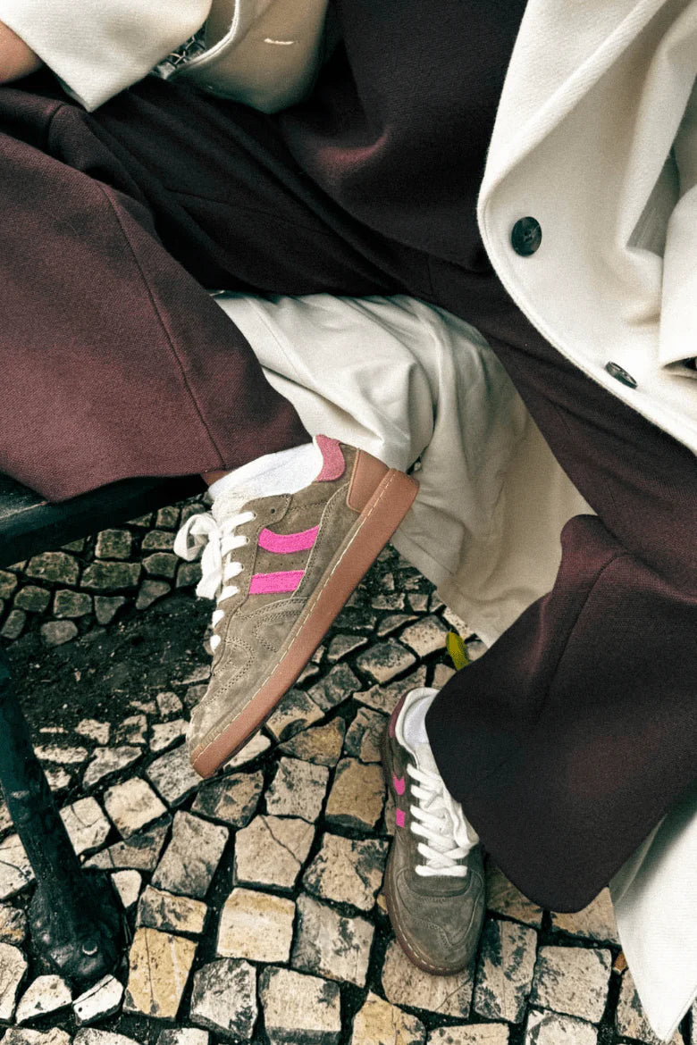Tenis deportiva de napa con detalles en contraste de color. Lengüeta de piel y preformada con un acolchado figurado. Vistas del forro en piel. Cordones planos de algodón en dos tonos intercambiables. Cuello ligeramente acolchado. La parte delantera lleva un refuerzo de pespuntes. Suela flexible de goma/caucho que aporta durabilidad y agarre. Cuenta con el nombre del modelo “GOAL” en lateral en oro viejo.