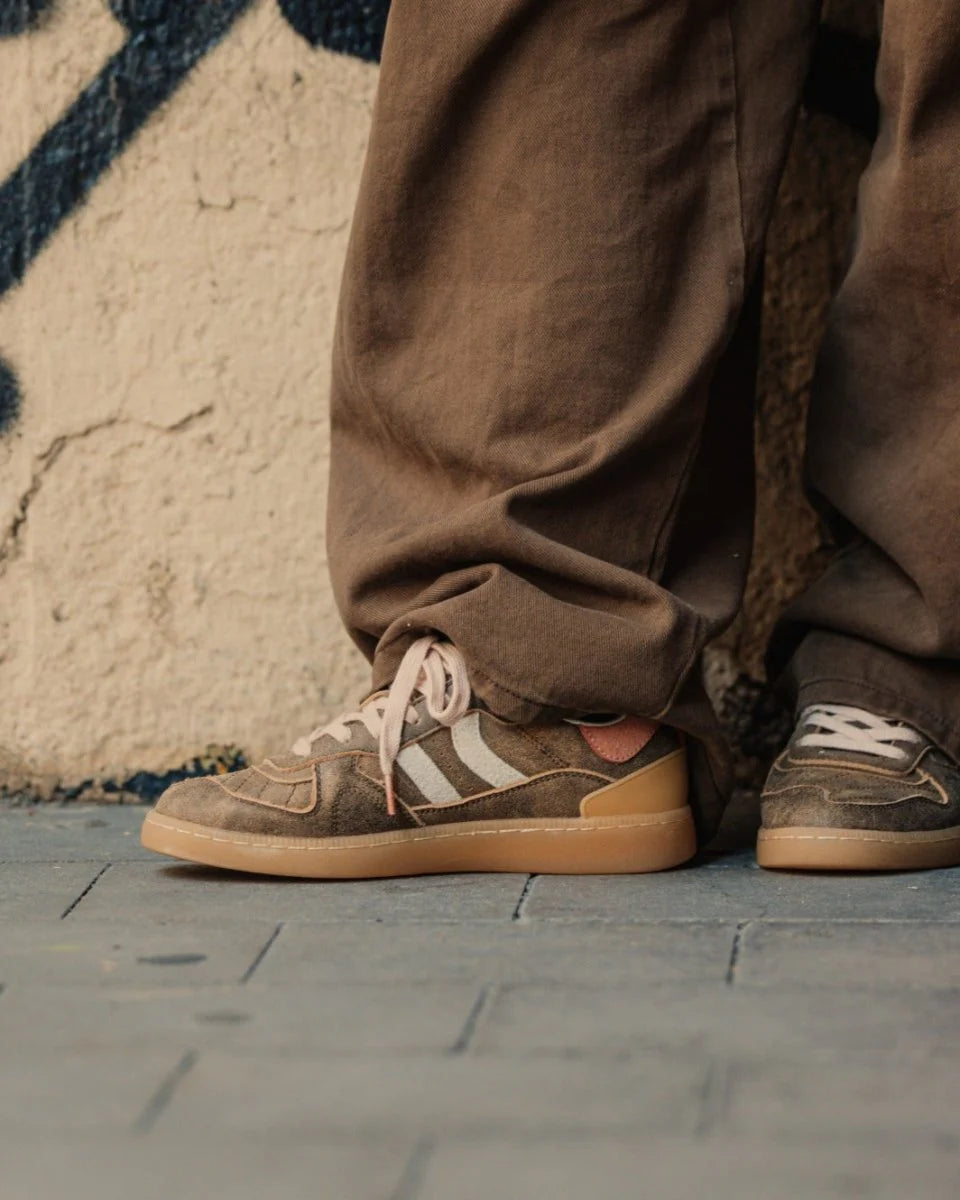 Tenis deportiva de napa con detalles en contraste de color. Lengüeta de piel y preformada con un acolchado figurado. Vistas del forro en piel. Cordones planos de algodón en dos tonos intercambiables. Cuello ligeramente acolchado. La parte delantera lleva un refuerzo de pespuntes. Suela flexible de goma/caucho que aporta durabilidad y agarre. Cuenta con el nombre del modelo “GOAL” en lateral en oro viejo.