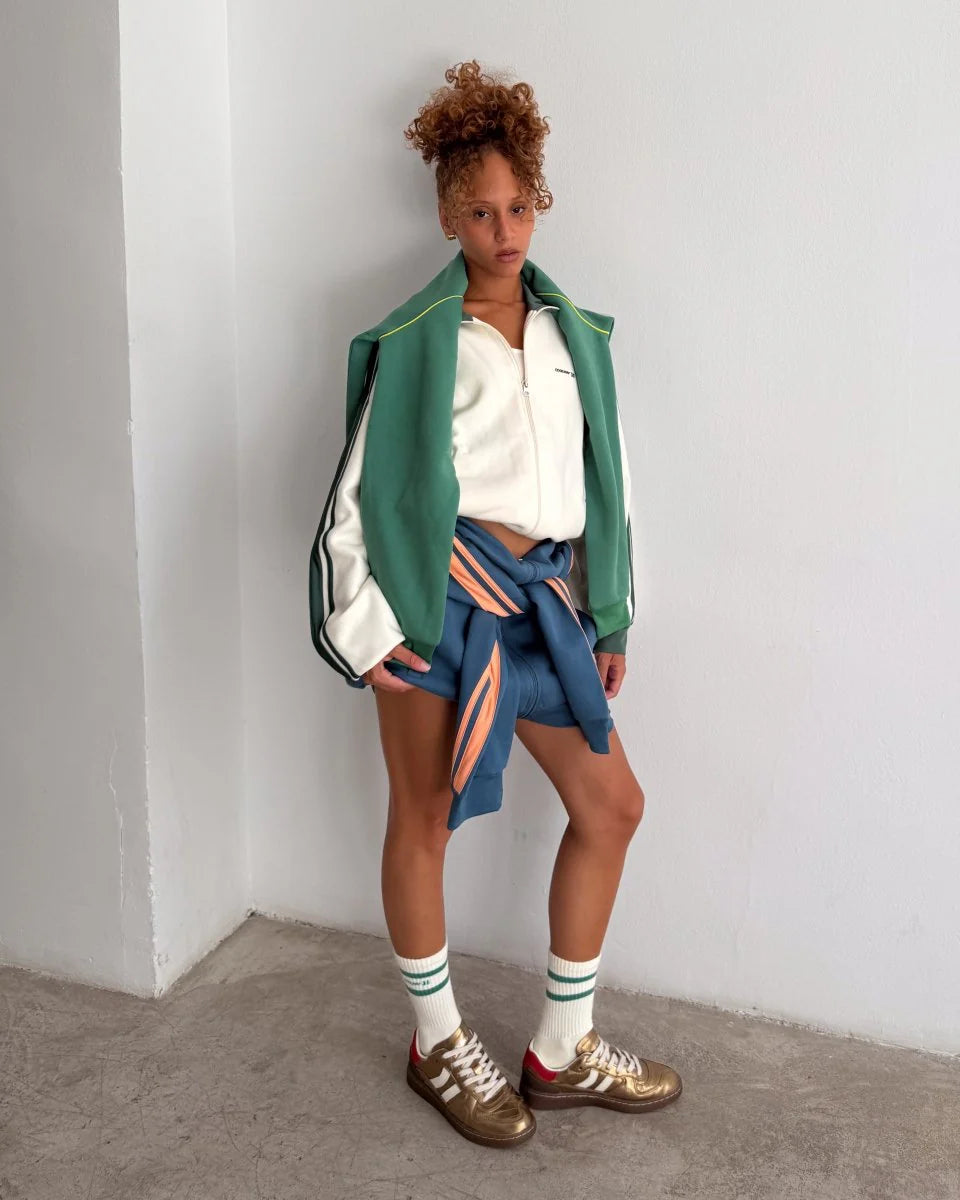 Tenis deportiva de napa con detalles en contraste de color. Lengüeta de piel y preformada con un acolchado figurado. Vistas del forro en piel. Cordones planos de algodón en dos tonos intercambiables. Cuello ligeramente acolchado. La parte delantera lleva un refuerzo de pespuntes. Suela flexible de goma/caucho que aporta durabilidad y agarre. Cuenta con el nombre del modelo “GOAL” en lateral en oro viejo.