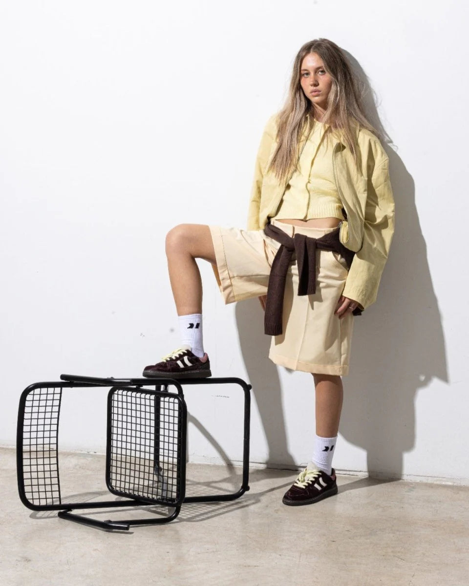 Tenis deportiva de napa con detalles en contraste de color. Lengüeta de piel y preformada con un acolchado figurado. Vistas del forro en piel. Cordones planos de algodón en dos tonos intercambiables. Cuello ligeramente acolchado. La parte delantera lleva un refuerzo de pespuntes. Suela flexible de goma/caucho que aporta durabilidad y agarre. Cuenta con el nombre del modelo “GOAL” en lateral en oro viejo.