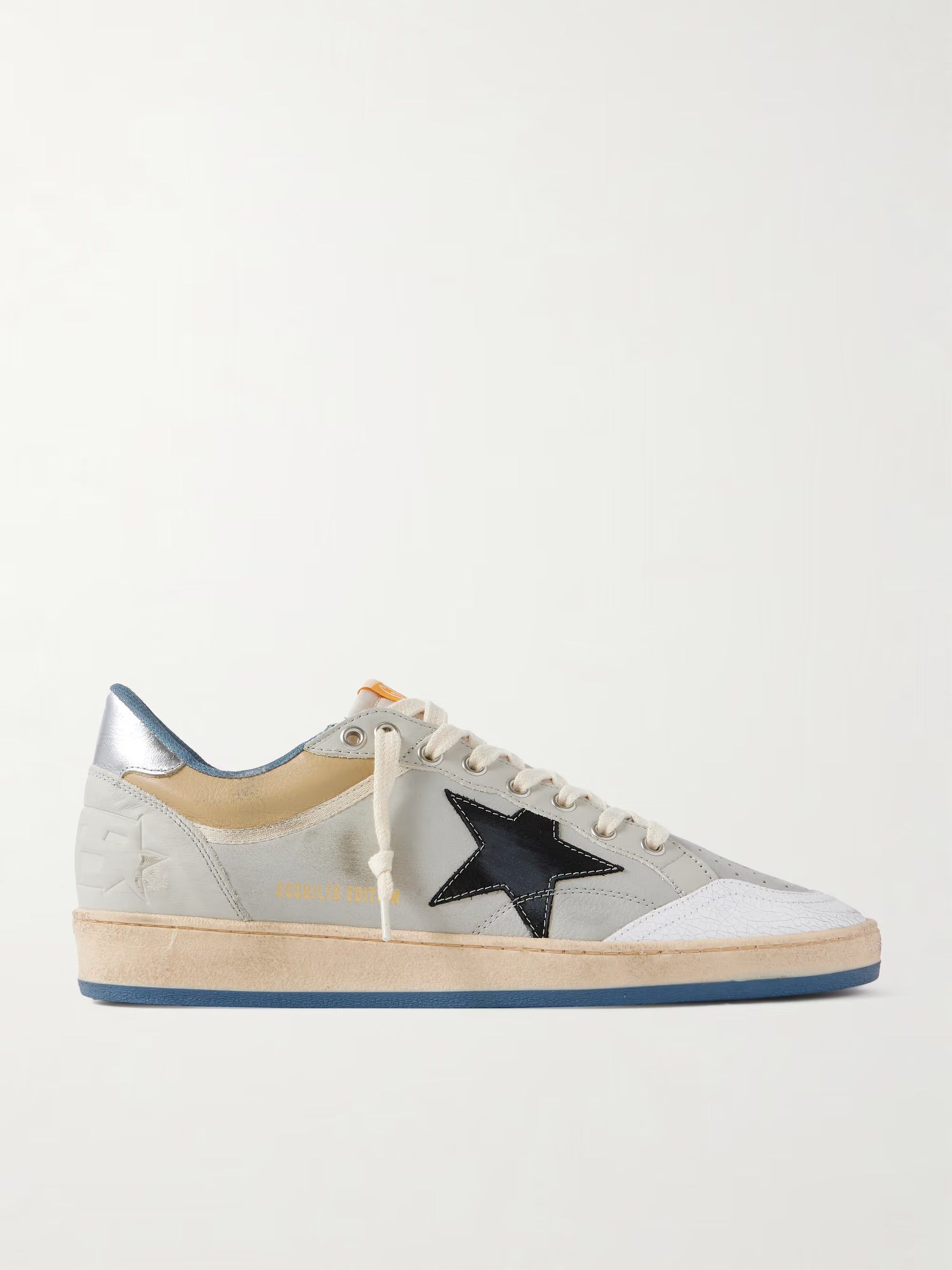 Tenis Golden Goose "Ballstar" con parte superior de nobuk y nailon, puntera de cuero agrietado, lengüeta de nailon, tacón laminado con forma de estrella de nobuk y espuela de cuero.