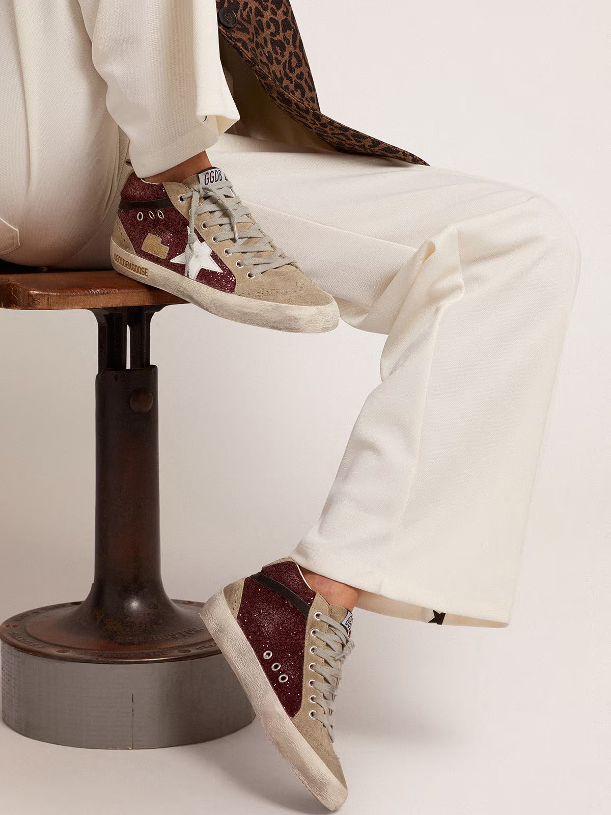 Versatilidad y una elegancia única: las zapatillas deportivas Mid Star se inspiran en la escena skate de los años ochenta, pero con un enfoque sofisticado. En este modelo, la pala con purpurina burdeos se caracteriza por sus aplicaciones de ante color gris paloma, su detalle de «coma» de piel negra y su estrella de piel blanca. Y como toque final de estilo, los cordones color gris hielo y los detalles con perforaciones de estilo inglés.