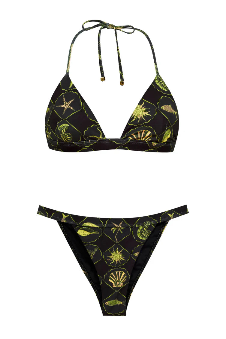 Nuestro top Alex es un estilo de triángulo fijo con base ribeteada y tirantes para atar al cuello. El cierre de la espalda tiene trabillas ajustables. Tiene copas suaves extraíbles. La tela es suave y estampada. Hecho en Colombia.