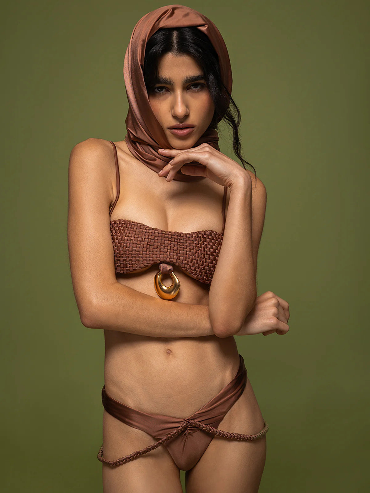 The Alma de Oro Top, tejido a mano en un patrón atemporal de entramado. En el corazón del diseño cuelga un adorno dorado central, inspirado en las piezas decorativas que llevan los caballos y el ganado, símbolos de fuerza, protección y conexión con la tierra. Una pieza llamativa que honra las raíces culturales mientras brilla con elegancia contemporanea.