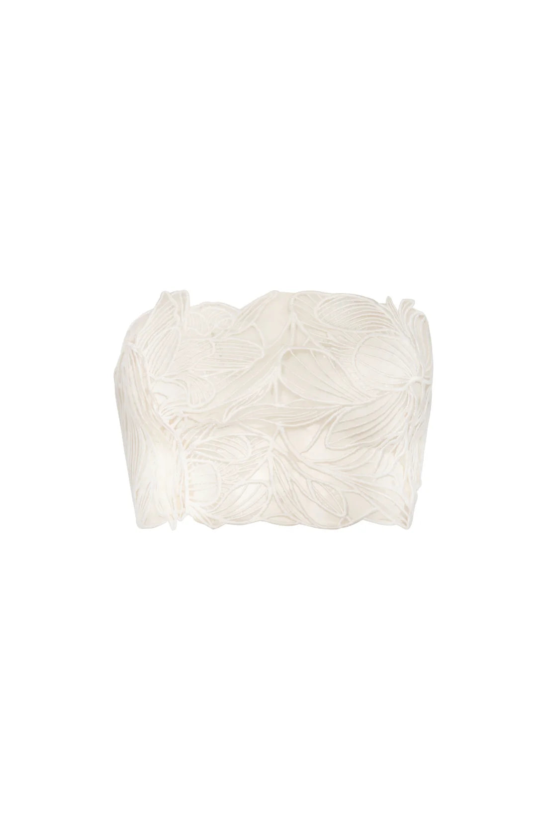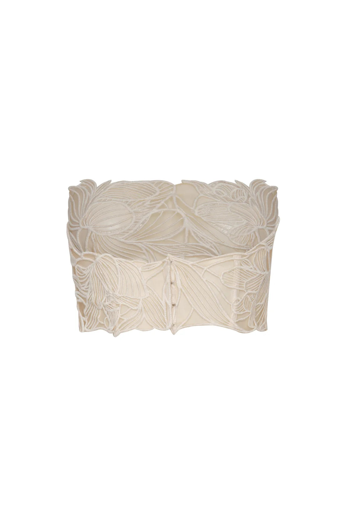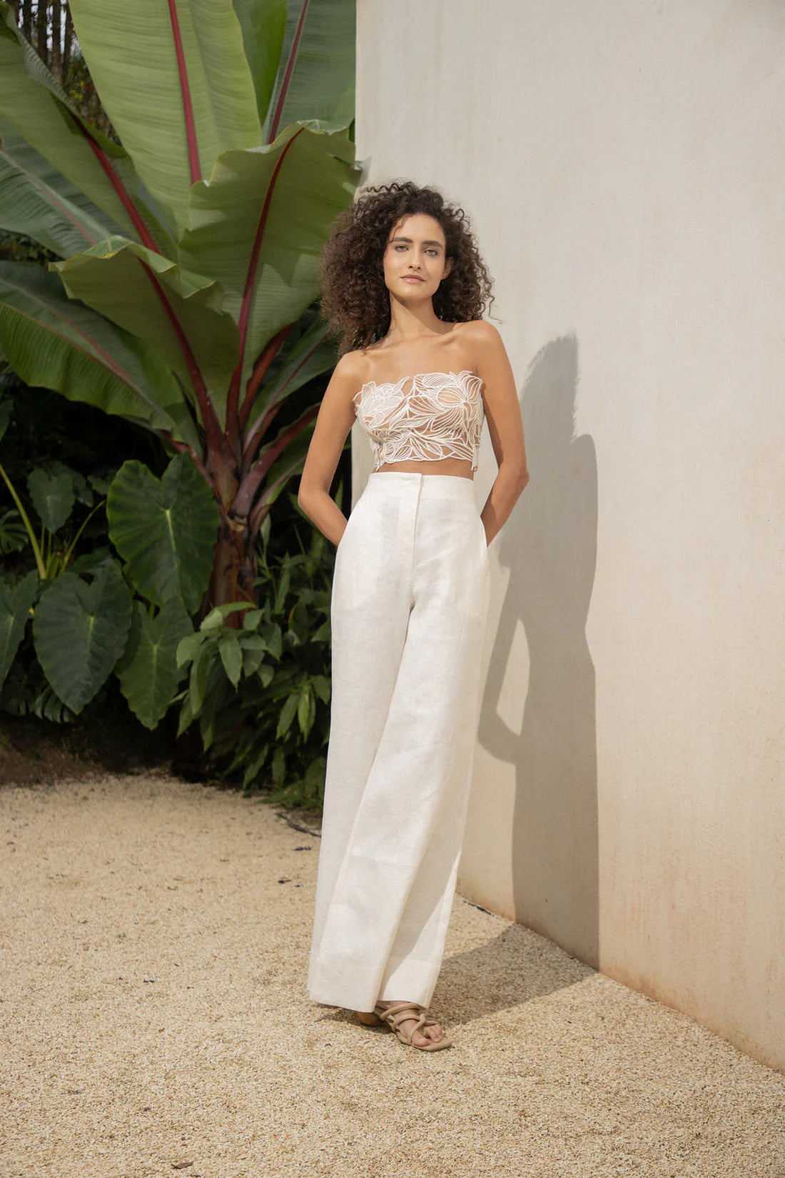 "Astromelia". Un top delicado con flores bordadas que parecen flotar sobre la piel. Su color suave lo hace perfecto para días especiales.