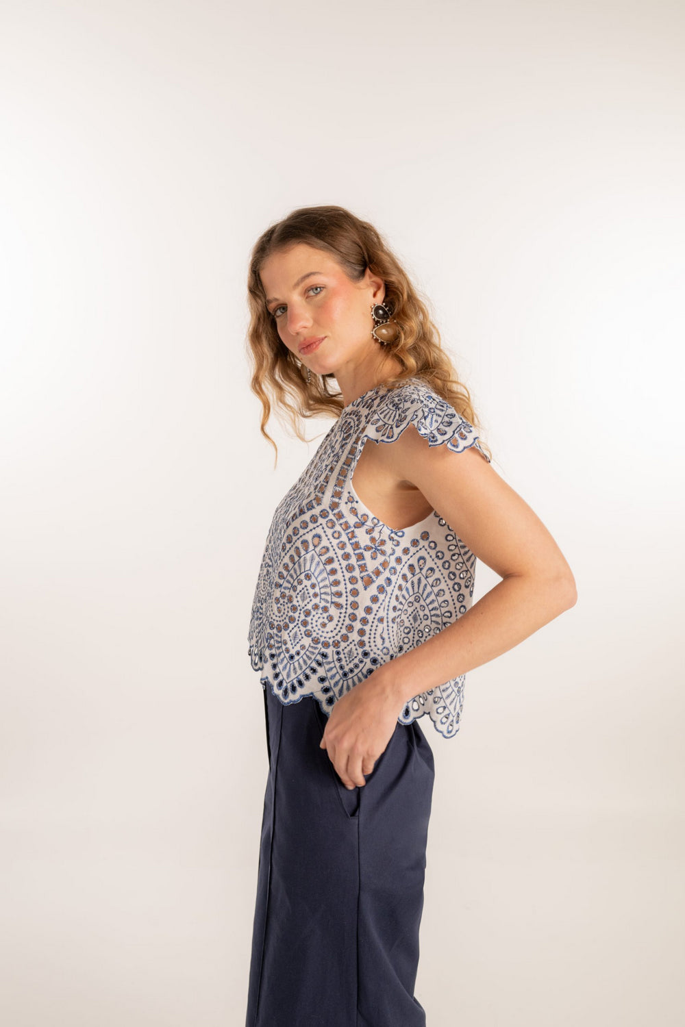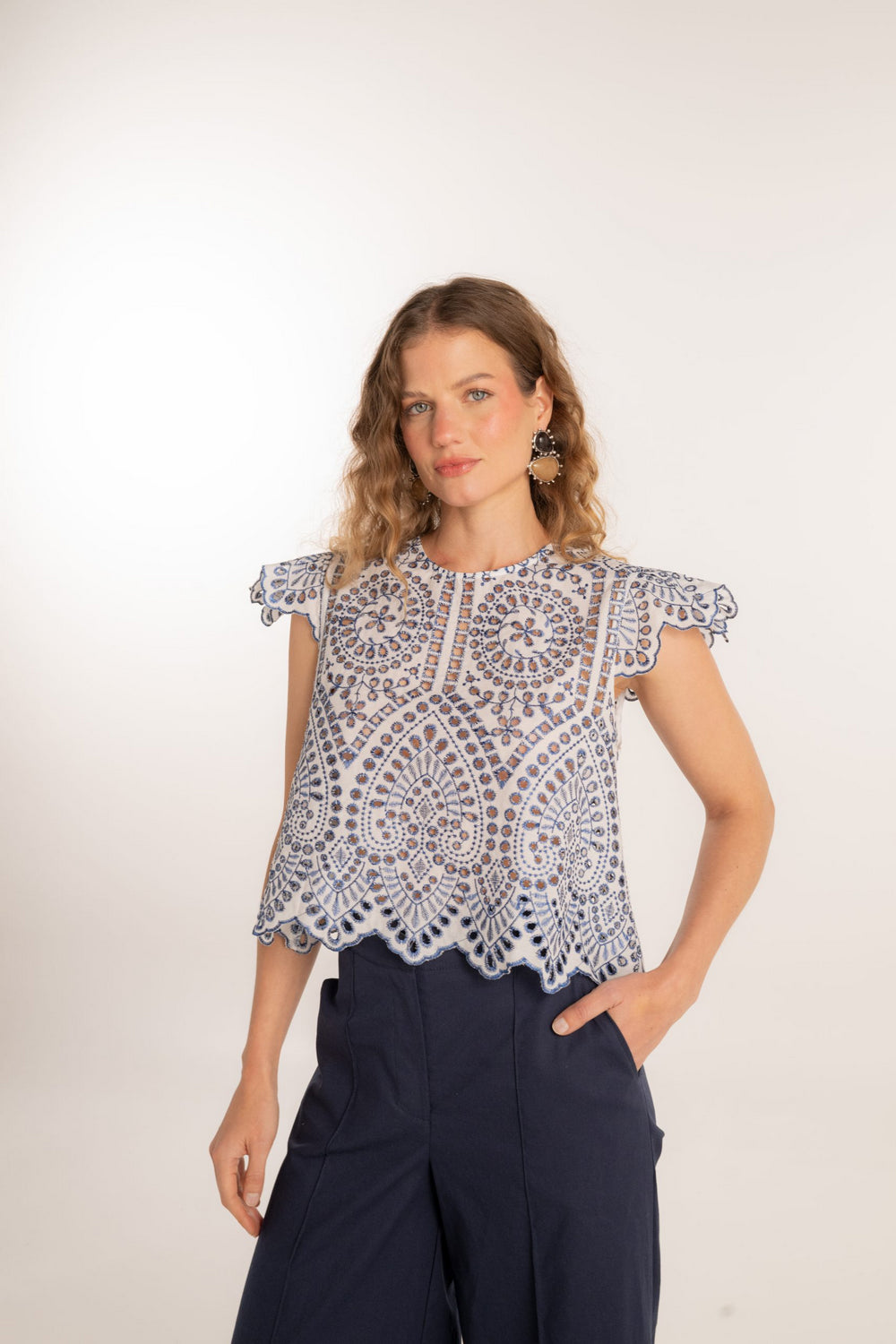 Este top en ojalillo es la definición de encanto sutil. Su cuello redondo aporta un toque clásico, mientras que las mangas mini lo hacen fresco y femenino. Confeccionado en algodón bordado, es perfecto para climas cálidos y looks relajados con un aire romántico. Ideal para combinar con jeans, faldas o shorts de lino, y elevar cualquier outfit con textura y estilo.