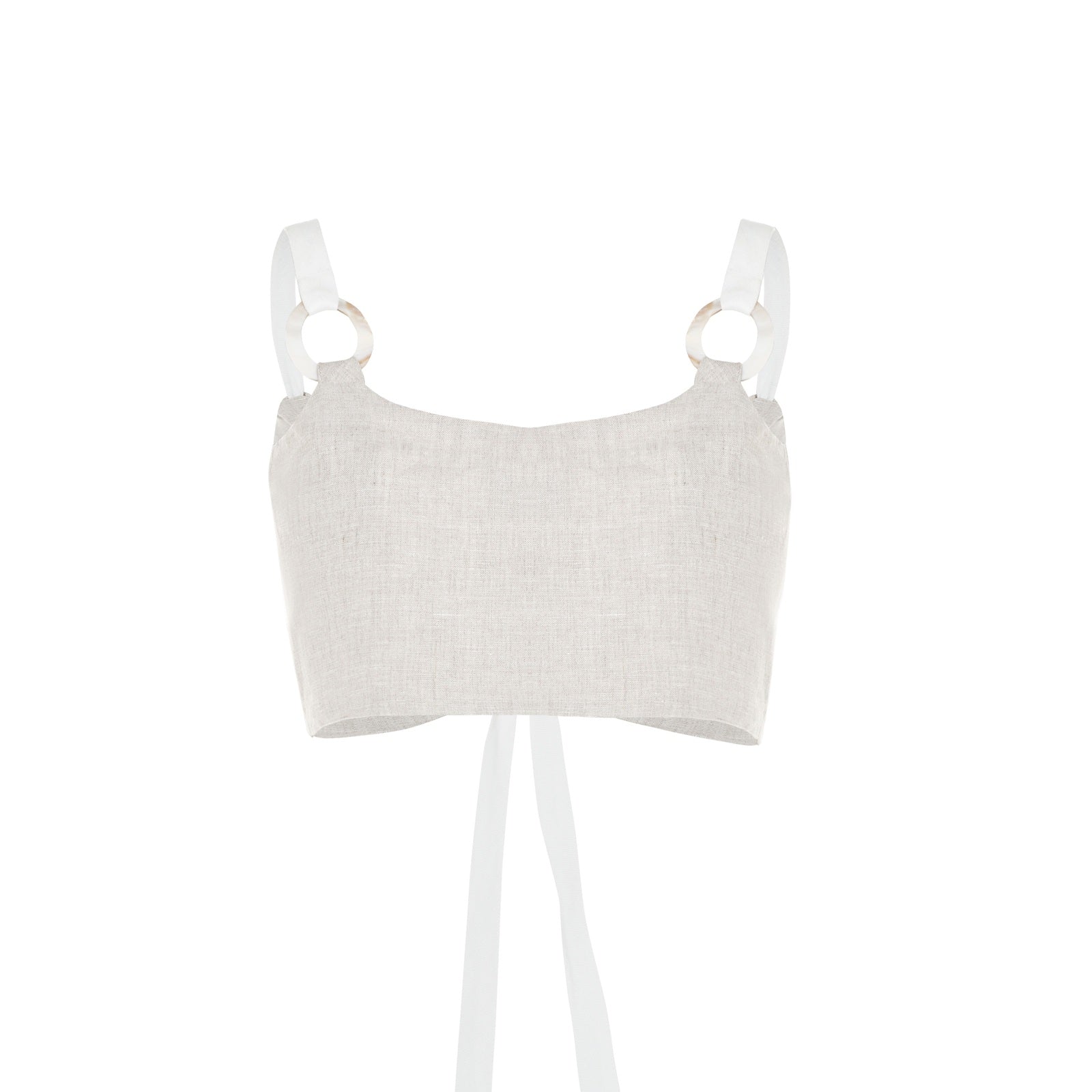 Top corto con escote fruncido y tiras con detalle en aro irregular de Madre Perla. Contraste en color Ivory.