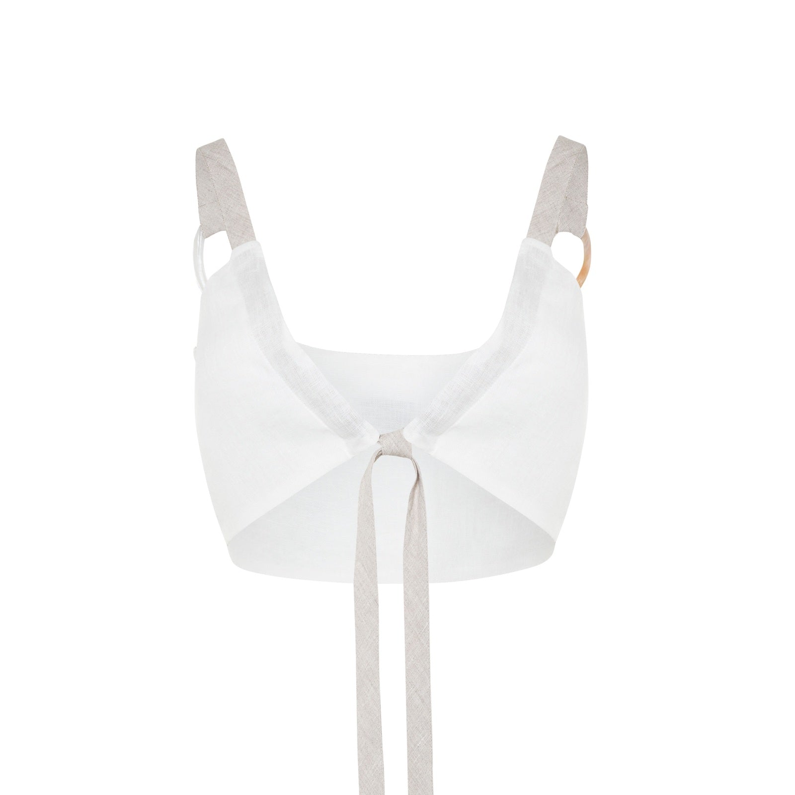 Top corto con escote fruncido y tiras con detalle en aro irregular de Madre Perla. Contraste en color Natural.